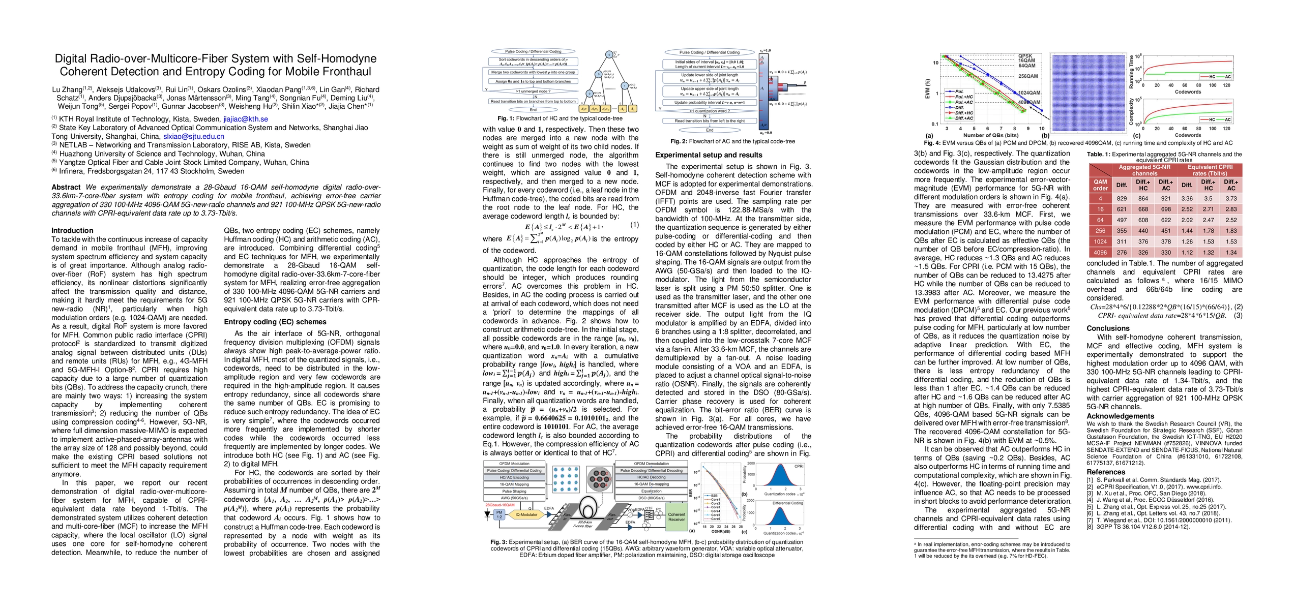 We experimentally demonstrate a 28-Gbaud 16-QAM self-homodyne digital radio-over- 33.6km-7-core-fiber system with entropy coding for mobile fronthaul, achieving error-free carrier aggregation of 330 100-MHz 4096-QAM 5G-new-radio channels and 921 100-MHz QPSK 5G-new-radio channels with CPRI-equivalent data rate up to 3.73-Tbit/s.