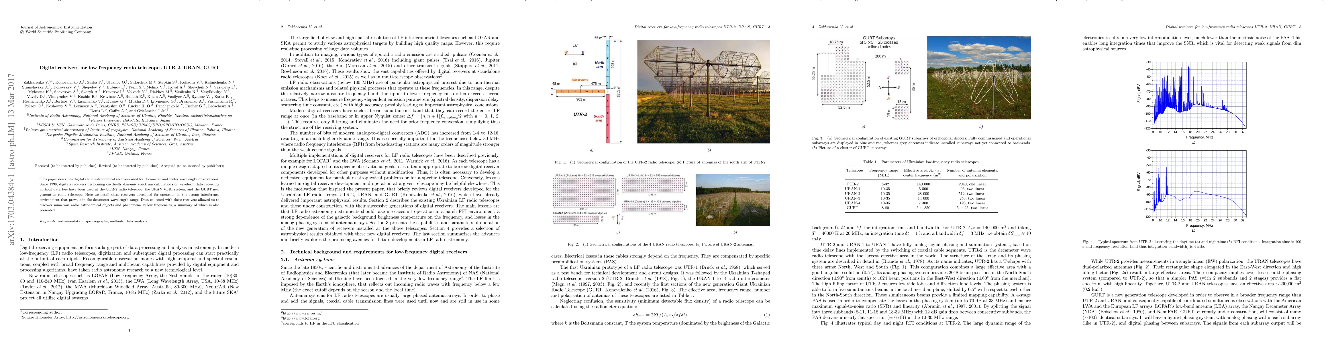 This paper describes digital radio astronomical receivers used for decameter and meter wavelength observations. This paper describes digital radio astronomical receivers used for decameter and meter wavelength observations. Since 1998, digital receivers performing on-the-fly dynamic spectrum calculations or waveform data recording without data loss have been used at the UTR-2 radio telescope, the URAN VLBI system, and the GURT new generation radio telescope. Here we detail these receivers developed for operation in the strong interference environment that prevails in the decameter wavelength range. Data collected with these receivers allowed us to discover numerous radio astronomical objects and phenomena at low frequencies, a summary of which is also presented.