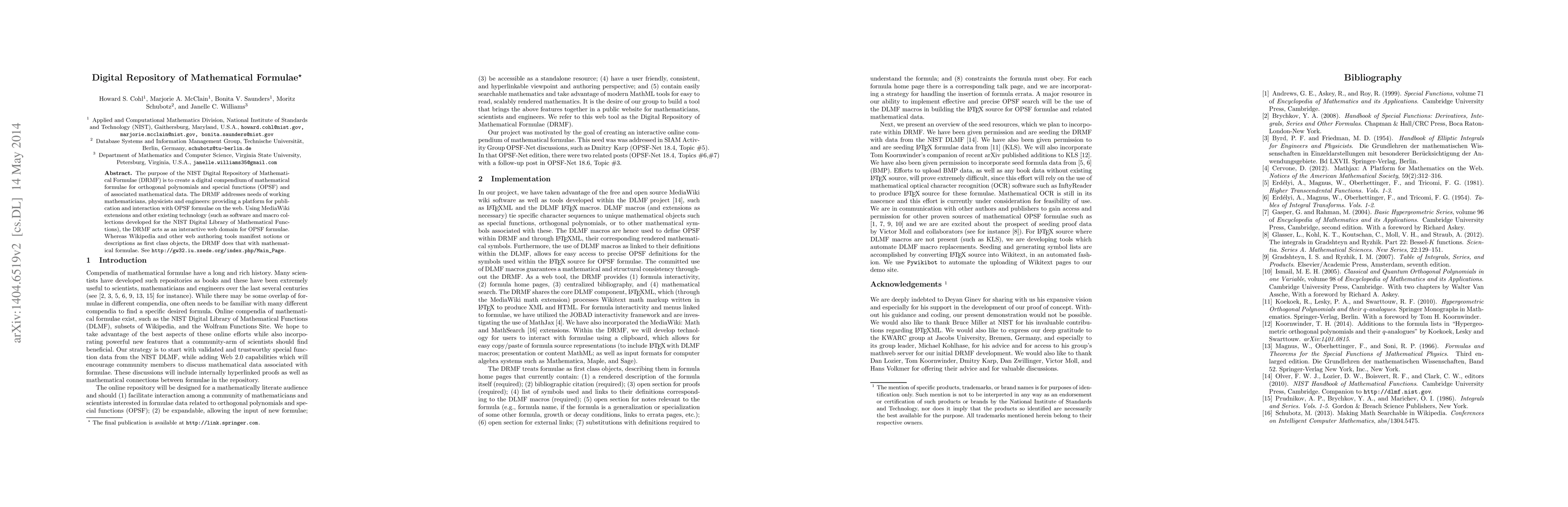 The NIST Digital Repository of Mathematical Formulae (DRMF) is an online compendium of orthogonal polynomials and special functions, aimed at serving mathematicians, physicists, and engineers. It utilizes MediaWiki extensions and existing technologies to provide an interactive platform for publishing and interacting with these mathematical formulae.