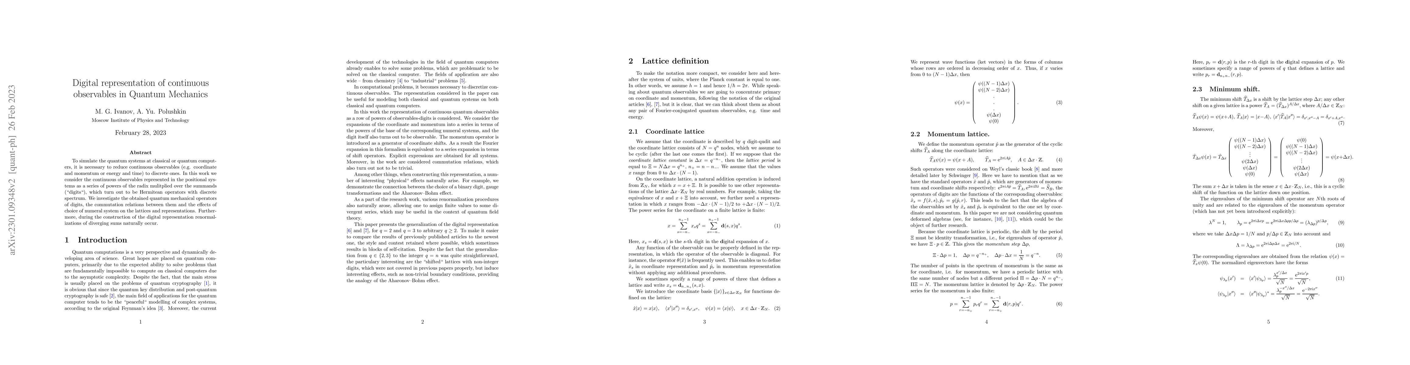 This paper explores the digital representation of continuous observables in quantum mechanics by discretizing them using positional systems. It investigates the properties of resulting Hermitean operators, their commutation relations, and the impact of numeral system choice on quantum representations, while noting the emergence of renormalizations during the process.