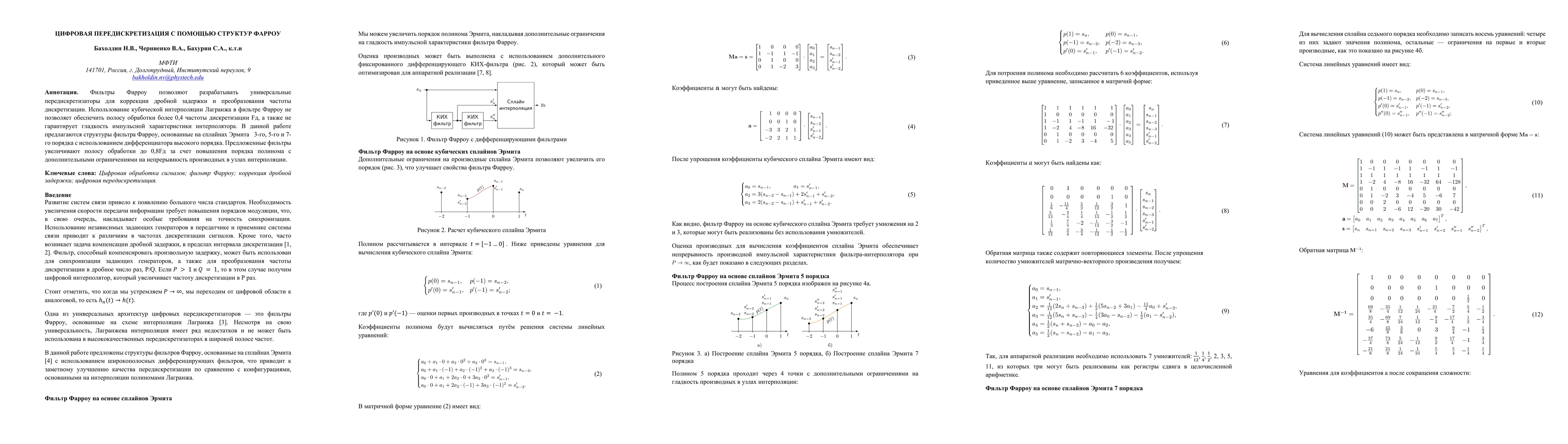 The paper proposes Farrow filter structures based on 3rd, 5th, and 7th order Hermite splines using a high-order differentiator, enhancing processing bandwidth up to 0.8 of the sampling frequency with additional constraints on the continuity of derivatives at interpolation nodes.