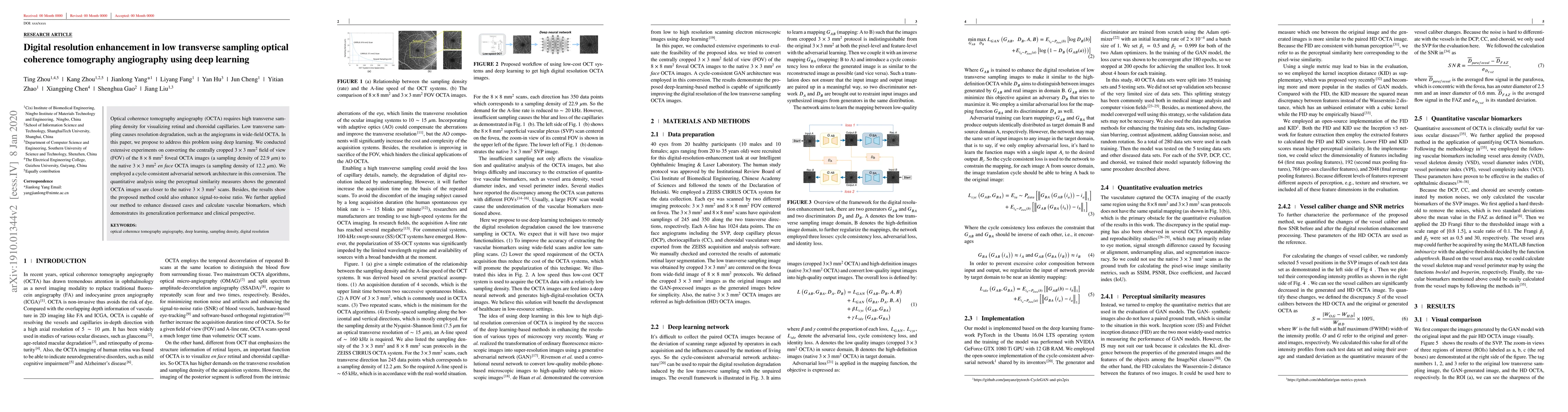 This paper proposes a deep learning approach using a cycle-consistent adversarial network to enhance the resolution of low transverse sampling optical coherence tomography angiography (OCTA) images. The method successfully converts low-density OCTA scans to higher-density images, improving both perceptual similarity and signal-to-noise ratio, and shows potential for clinical applications in disease diagnosis.