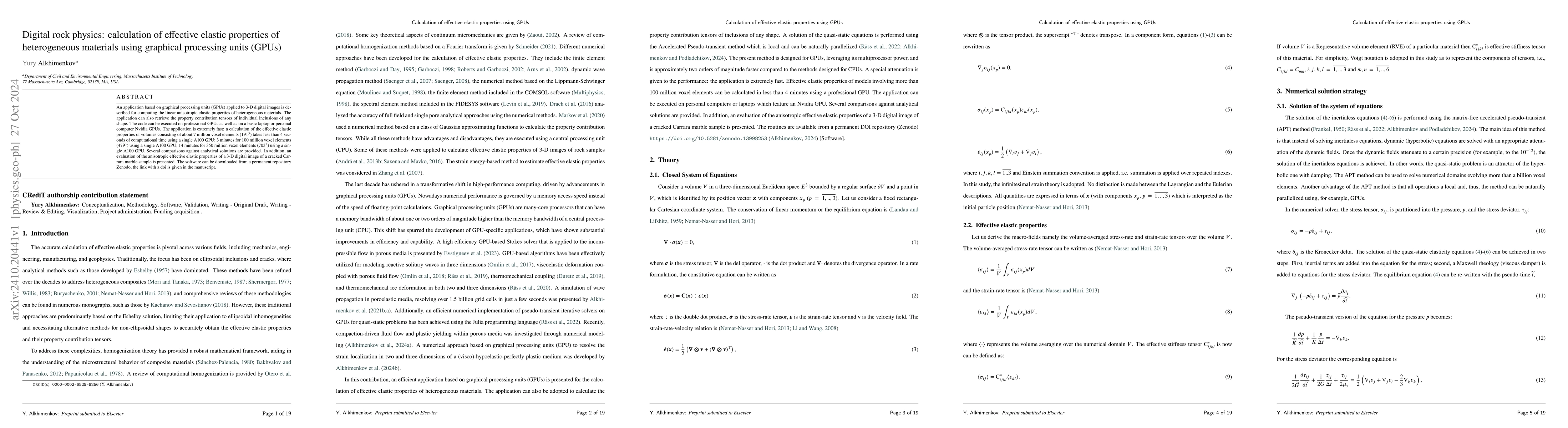 This research introduces a GPU-based application for calculating the effective elastic properties of heterogeneous materials from 3-D digital images, demonstrating significant speed improvements. The application retrieves individual inclusion properties and can handle large volumes efficiently, providing accurate comparisons to analytical solutions.