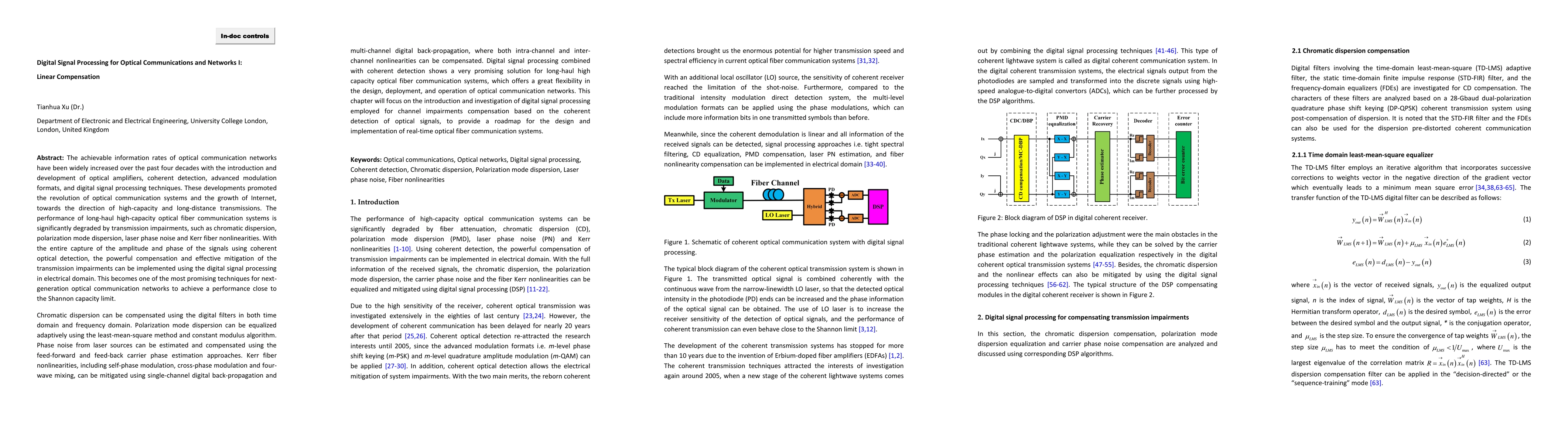 This paper explores the use of digital signal processing (DSP) for compensating channel impairments in optical communication networks, leveraging coherent detection to achieve high-capacity and long-distance transmissions. It provides a roadmap for implementing real-time optical fiber communication systems by mitigating issues like chromatic dispersion and polarization mode dispersion.