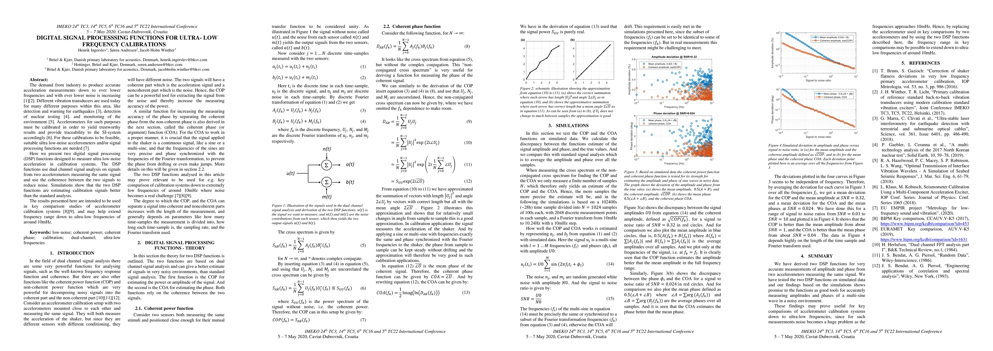 The demand from industry to produce accurate acceleration measurements down to ever lower frequencies and with ever lower noise is increasing. Different vibration transducers are used today for many different purposes within this area, like detection and warning for earthquakes, detection of nuclear testing, and monitoring of the environment. Accelerometers for such purposes must be calibrated in order to yield trustworthy results and provide traceability to the SI-system accordingly. For these calibrations to be feasible, suitable ultra low-noise accelerometers and/or signal processing functions are needed. Here we present two digital signal processing (DSP) functions designed to measure ultra low-noise acceleration in calibration systems. The DSP functions use dual channel signal analysis on signals from two accelerometers measuring the same signal and use the coherence between the two signals to reduce noise. Simulations show that the two DSP functions are estimating calibration signals better than the standard analysis. The results presented here are intended to be used in key comparison studies of accelerometer calibration systems, and may help extend frequency range down to ultra-low frequencies of around 10mHz.