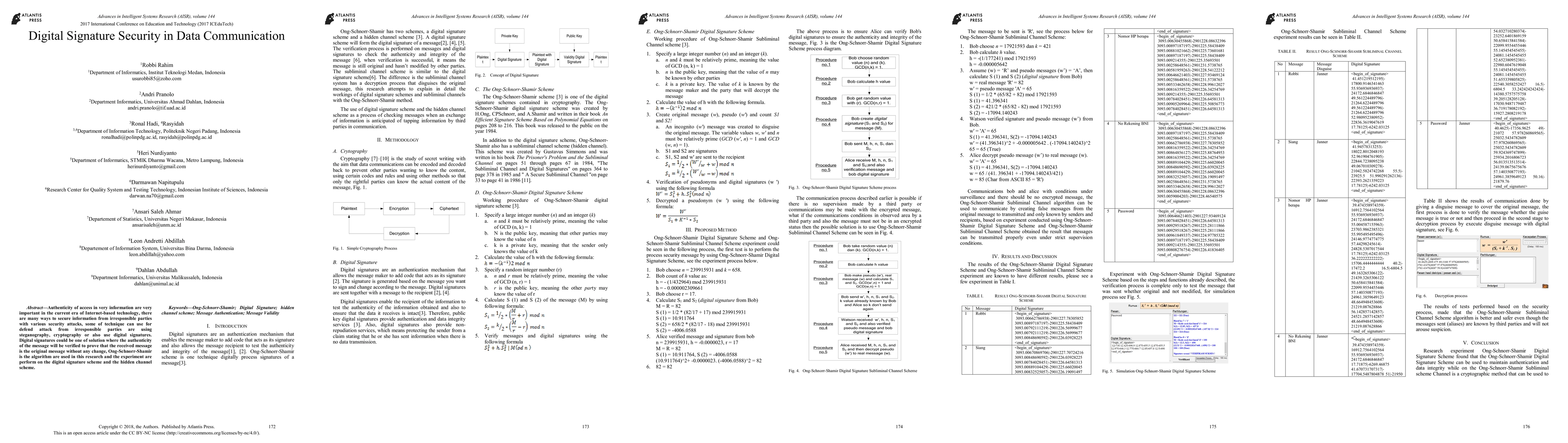 Authenticity of access in very information are very important in the current era of Internet-based technology, there are many ways to secure information from irresponsible parties with various security attacks, some of technique can use for defend attack from irresponsible parties are using steganography, cryptography or also use digital signatures. Digital signatures could be one of solution where the authenticity of the message will be verified to prove that the received message is the original message without any change, Ong-Schnorr-Shamir is the algorithm are used in this research and the experiment are perform on the digital signature scheme and the hidden channel scheme.