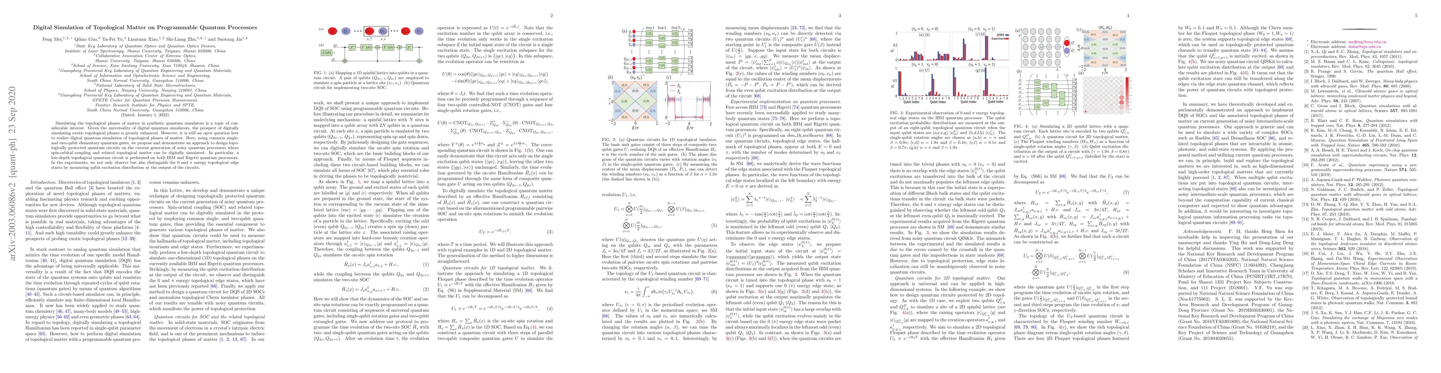 This paper proposes a method to digitally simulate topological phases of matter using common quantum gates on current noisy quantum processors. Experiments on IBM and Rigetti quantum processors demonstrate the realization of low-depth topological quantum circuits, successfully distinguishing 0 and $\pi$ energy topological edge states.