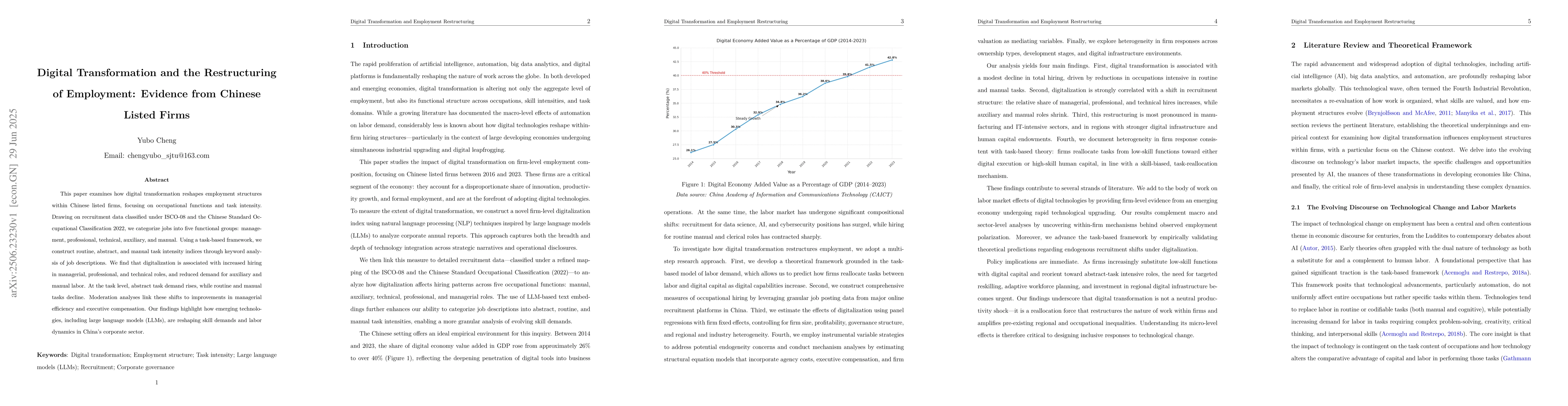 This paper examines how digital transformation reshapes employment structures within Chinese listed firms, focusing on occupational functions and task intensity. Drawing on recruitment data classified under ISCO-08 and the Chinese Standard Occupational Classification 2022, we categorize jobs into five functional groups: management, professional, technical, auxiliary, and manual. Using a task-based framework, we construct routine, abstract, and manual task intensity indices through keyword analysis of job descriptions. We find that digitalization is associated with increased hiring in managerial, professional, and technical roles, and reduced demand for auxiliary and manual labor. At the task level, abstract task demand rises, while routine and manual tasks decline. Moderation analyses link these shifts to improvements in managerial efficiency and executive compensation. Our findings highlight how emerging technologies, including large language models (LLMs), are reshaping skill demands and labor dynamics in Chinas corporate sector.