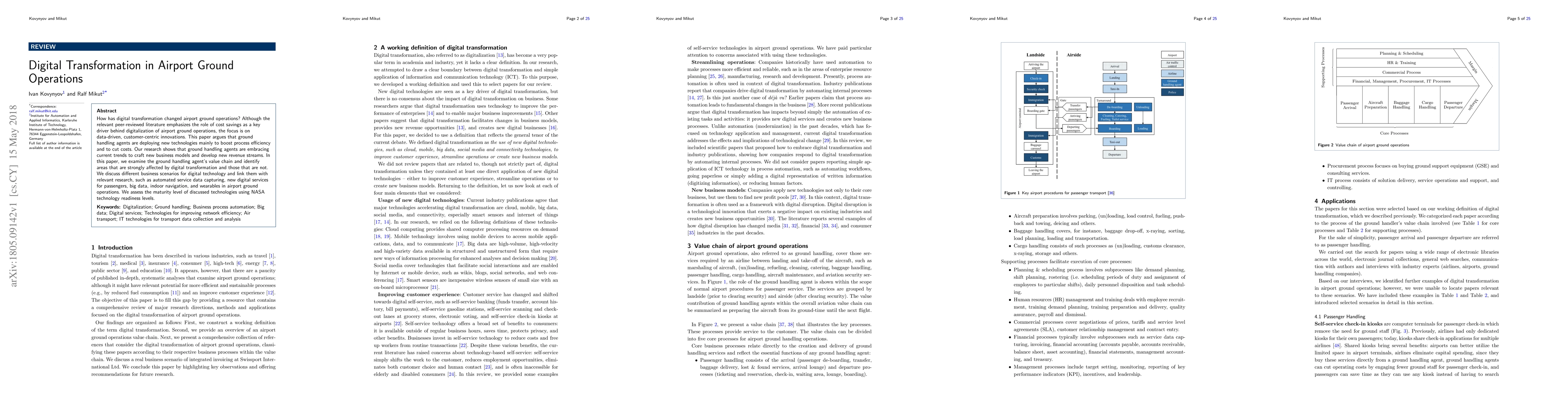 How has digital transformation changed airport ground operations? Although the relevant peer-reviewed literature emphasizes the role of cost savings as a key driver behind digitalization of airport ground operations, the focus is on data-driven, customer-centric innovations. This paper argues that ground handling agents are deploying new technologies mainly to boost process efficiency and to cut costs. Our research shows that ground handling agents are embracing current trends to craft new business models and develop new revenue streams. In this paper, we examine the ground handling agent's value chain and identify areas that are strongly affected by digital transformation and those that are not. We discuss different business scenarios for digital technology and link them with relevant research, such as automated service data capturing, new digital services for passengers, big data, indoor navigation, and wearables in airport ground operations. We assess the maturity level of discussed technologies using NASA technology readiness levels.