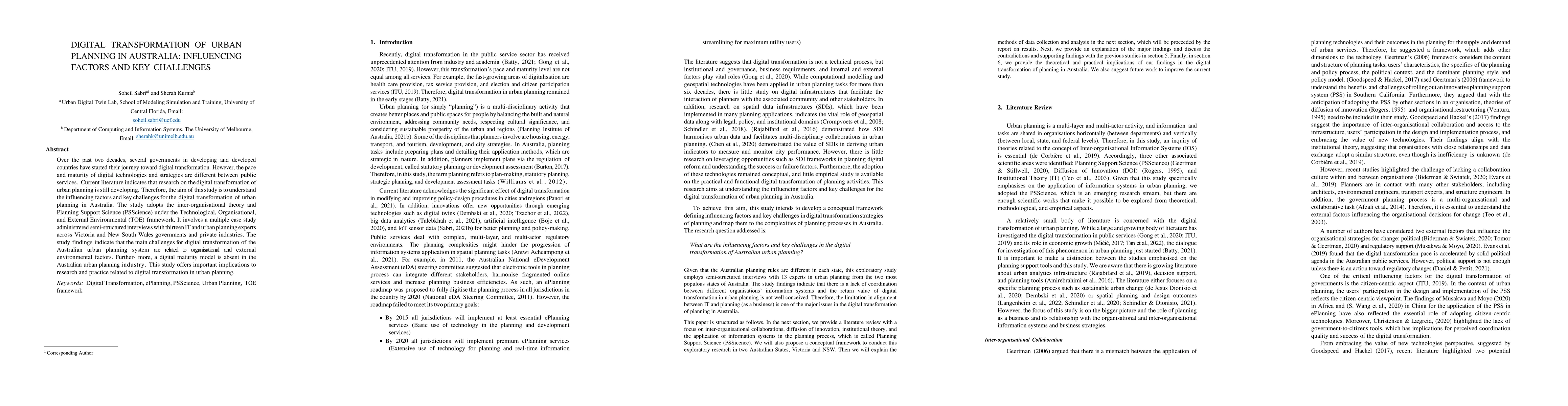 Over the past two decades, several governments in developing and developed countries have started their journey toward digital transformation. However, the pace and maturity of digital technologies and strategies are different between public services. Current literature indicates that research on the digital transformation of urban planning is still developing. Therefore, the aim of this study is to understand the influencing factors and key challenges for the digital transformation of urban planning in Australia. The study adopts the inter-organisational theory and Planning Support Science (PSScience) under the Technological, Organisational, and External Environmental (TOE) framework. It involves a multiple case study, administered semi-structured interviews with thirteen IT and urban planning experts across Victoria and New South Wales governments and private industries. The study findings indicate that the main challenges for digital transformation of the Australian urban planning system are related to organisational and external environmental factors. Furthermore, a digital maturity model is absent in the Australian urban planning industry. This study offers important implications to research and practice related to digital transformation in urban planning.