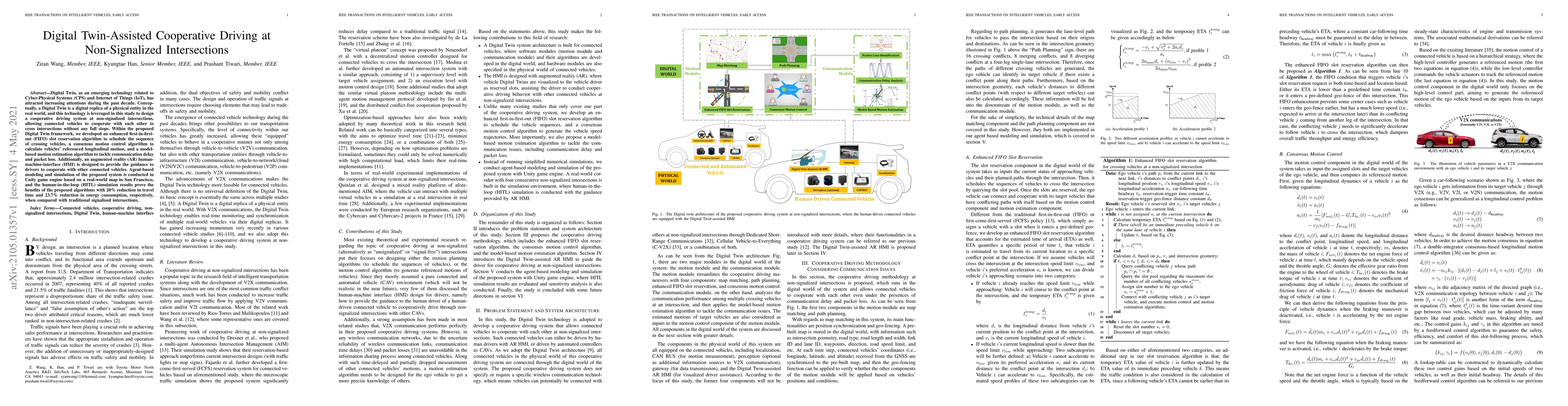 This paper proposes a Digital Twin-assisted cooperative driving system for non-signalized intersections, utilizing an enhanced FIFO algorithm, consensus motion control, and model-based estimation to optimize vehicle crossing sequences. Simulation results show a 20% reduction in travel time and 23.7% reduction in energy consumption compared to traditional intersections.