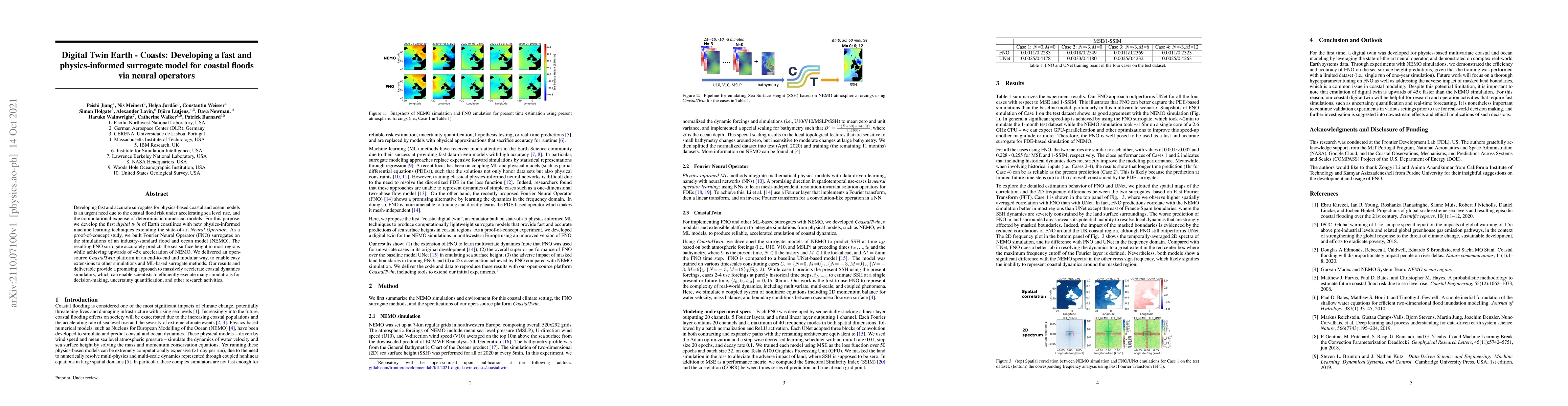 This paper develops a fast and physics-informed surrogate model for coastal flood simulations using Fourier Neural Operators, achieving up to 45x speedup over traditional models. The open-source CoastalTwin platform enables efficient execution of simulations for decision-making and research.