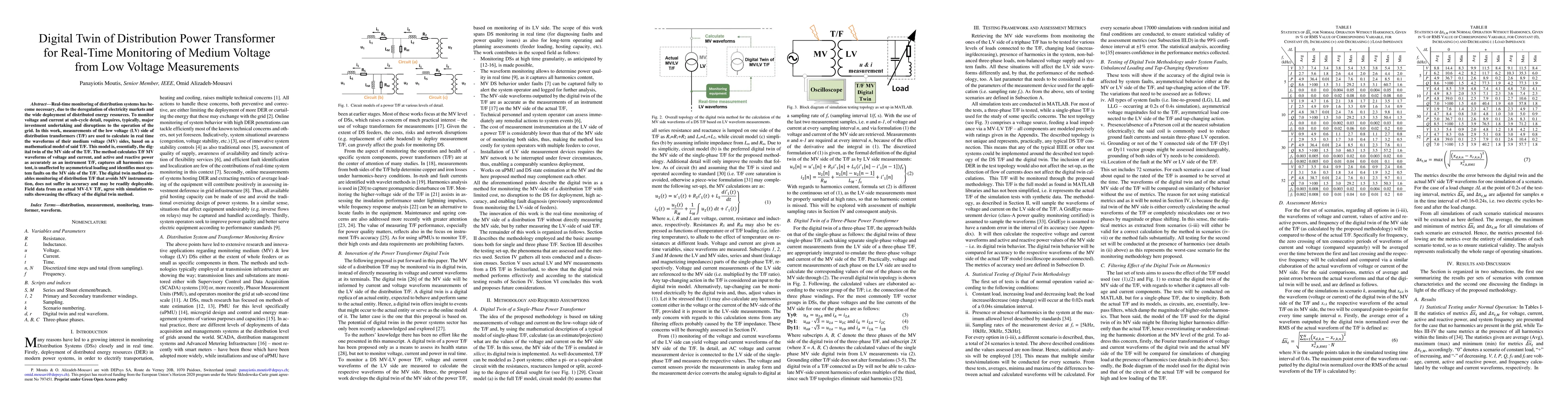 Real-time monitoring of distribution systems has be-come necessary, due to the deregulation of electricity markets and the wide deployment of distributed energy resources. To monitor voltage and current at sub-cycle detail, requires, typically, major investment undertaking and disruptions to the operation of the grid. In this work, measurements of the low voltage (LV) side of distribution transformers (T/F) are used to calculate in real time the waveforms of their medium voltage (MV) sides, based on a mathematical model of said T/F. This model is, essentially, the dig-ital twin of the MV side of the T/F. The method calculates T/F MV waveforms of voltage and current, and active and reactive power as accurately as an instrument T/F, captures all harmonics con-tent, is unaffected by asymmetrical loading and identifies most sys-tem faults on the MV side of the T/F. The digital twin method en-ables monitoring of distribution T/F that avoids MV instrumenta-tion, does not suffer in accuracy and may be readily deployable. Field data from an actual MV-LV T/F, agree with simulation re-sults showcasing the efficacy of the digital twin method.