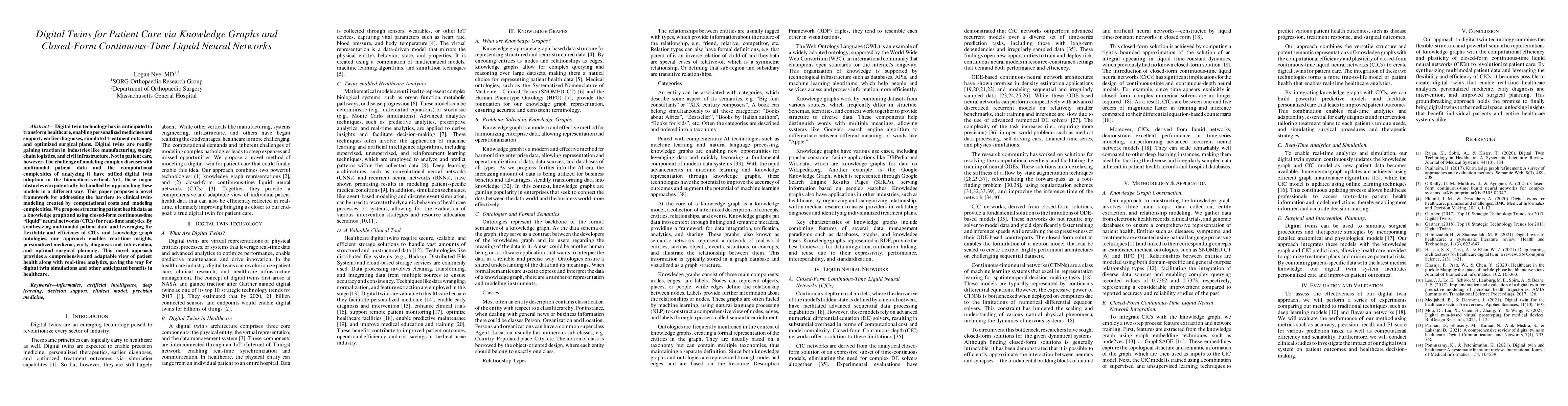 This paper proposes a novel framework using knowledge graphs and closed-form continuous-time liquid neural networks to create digital twins for patient care, addressing computational and modeling complexities. The approach enables real-time analytics, personalized medicine, early diagnosis, and optimal surgical planning.