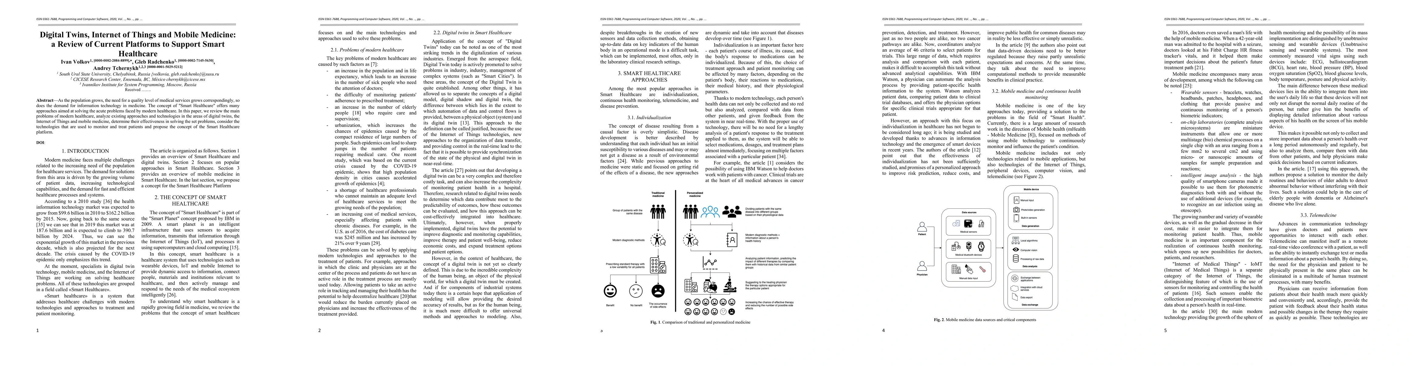 As the population grows, the need for a quality level of medical services grows correspondingly, so does the demand for information technology in medicine. The concept of "Smart Healthcare" offers many approaches aimed at solving the acute problems faced by modern healthcare. In this paper, we review the main problems of modern healthcare, analyze existing approaches and technologies in the areas of digital twins, the Internet of Things and mobile medicine, determine their effectiveness in solving the set problems, consider the technologies that are used to monitor and treat patients and propose the concept of the Smart Healthcare platform.