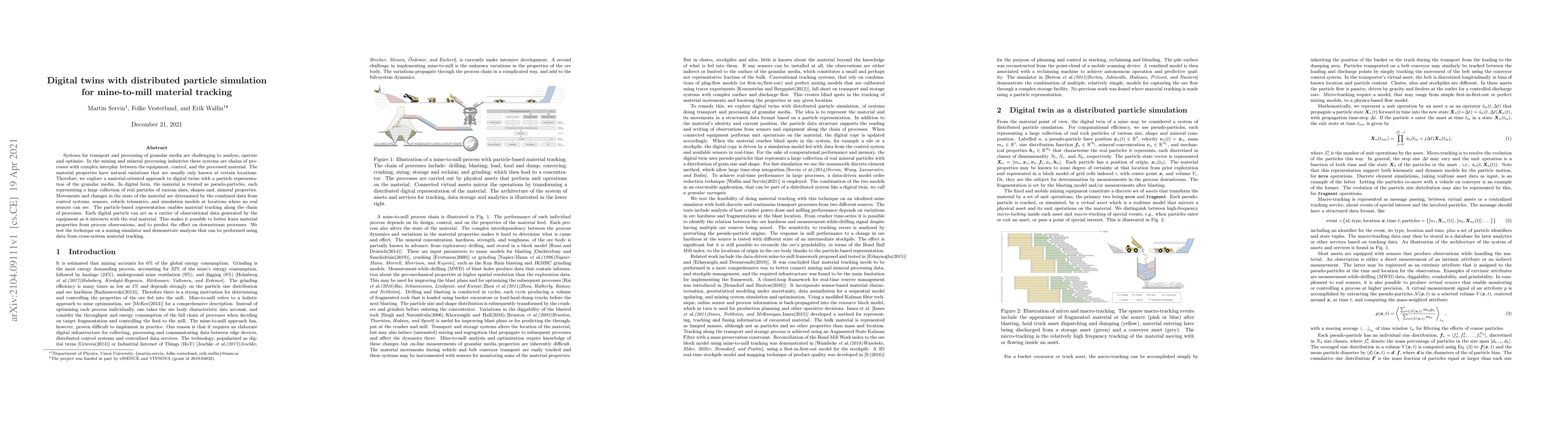 This paper proposes a digital twin approach using distributed particle simulation to track granular media in mining and mineral processing systems. The method employs pseudo-particles to represent material properties and interactions, enabling better learning and prediction of material behavior across processes.