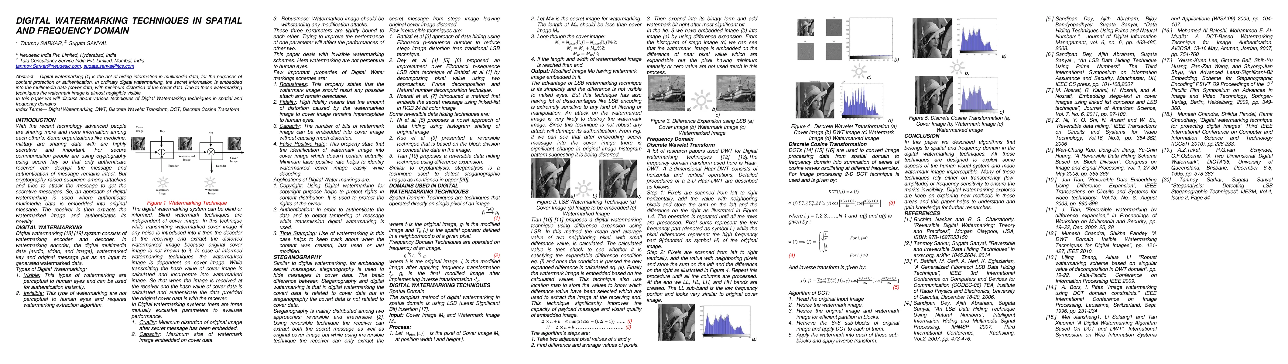 The paper presents a comprehensive overview of digital watermarking techniques in spatial and frequency domains, including LSB insertion, difference expansion, DWT, and DCT methods.