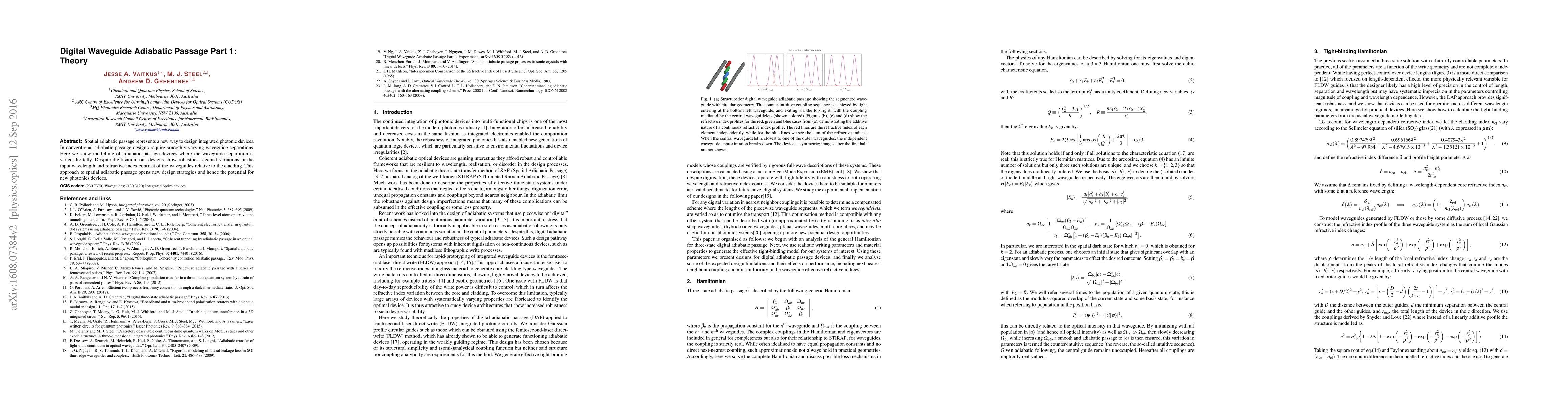 This paper introduces the theory behind digital waveguide adiabatic passage for integrated photonic devices, demonstrating robust design strategies despite digital waveguide separation variations. This novel approach offers new design possibilities for advanced photonics applications.