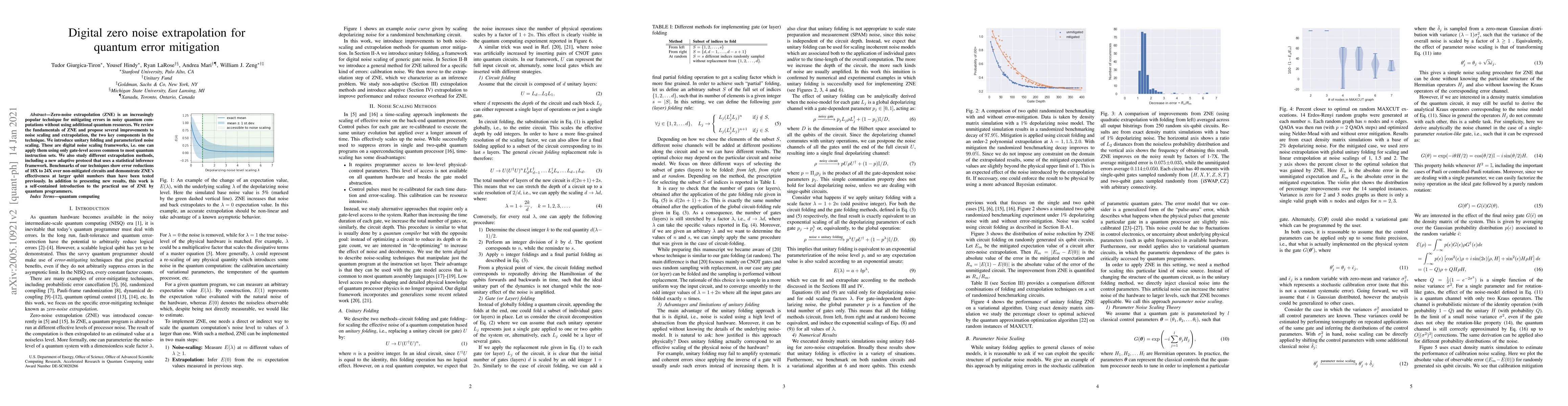 This paper reviews zero-noise extrapolation (ZNE) for quantum error mitigation and proposes improvements, including unitary folding and parameterized noise scaling, to enhance its effectiveness. The study demonstrates significant error reductions and extends the technique's applicability to larger qubit systems.