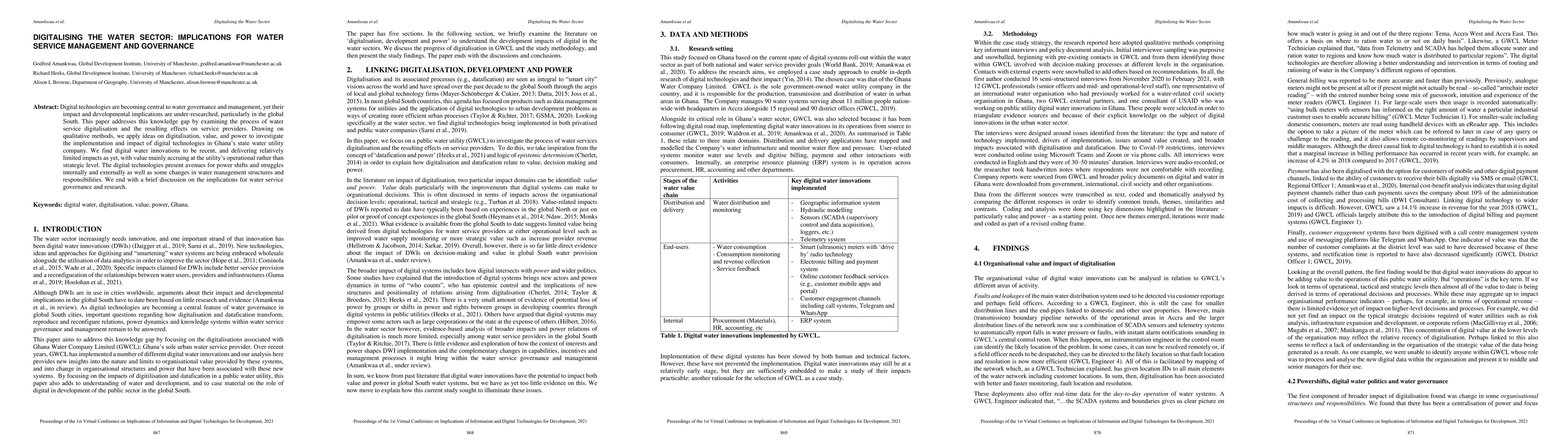 Digital technologies are becoming central to water governance and management, yet their impact and developmental implications are under-researched, particularly in the global South. This paper addresses this knowledge gap by examining the process of water service digitalisation and the resulting effects on service providers. Drawing on qualitative methods, we apply ideas on digitalisation, value, and power to investigate the implementation and impact of digital technologies in Ghana's state water utility company. We find digital water innovations to be recent, and delivering relatively limited impacts as yet, with value mainly accruing at the utility's operational rather than strategic level. The digital technologies present avenues for power shifts and struggles internally and externally as well as some changes in water management structures and responsibilities. We end with a brief discussion on the implications for water service governance and research.