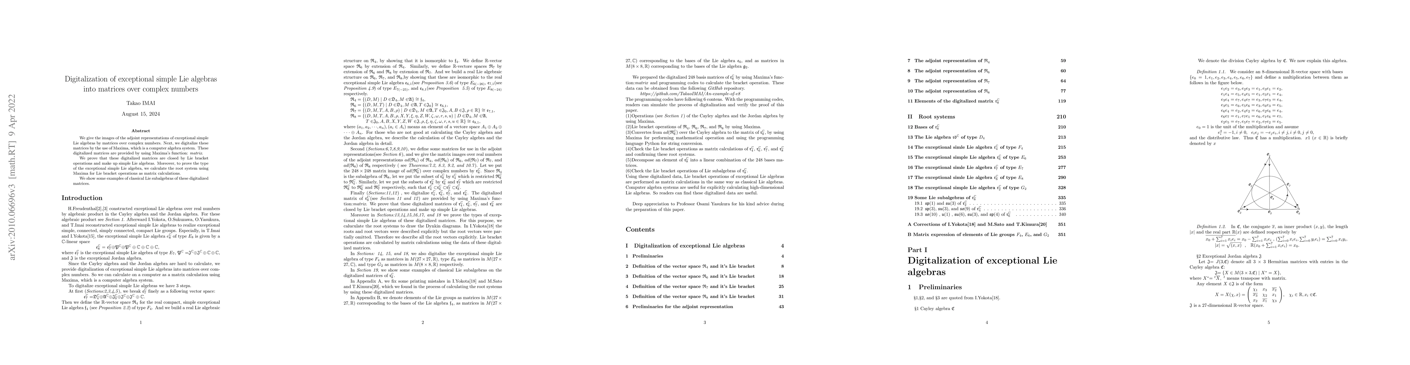 We give the images of the adjoint representations of exceptional simple Lie algebras by matrices over complex numbers. Next, we digitalize these matrices by the use of Maxima, which is a computer algebra system. These digitalized matrices are provided by using Maxima's function. We prove that these digitalized matrices are closed by Lie bracket operations and make up simple Lie algebras. Moreover, to prove the type of the exceptional simple Lie algebra, we calculate the root system using Maxima for Lie bracket operations as matrix calculations. We show some examples of classical Lie subalgebras of these digitalized matrices.