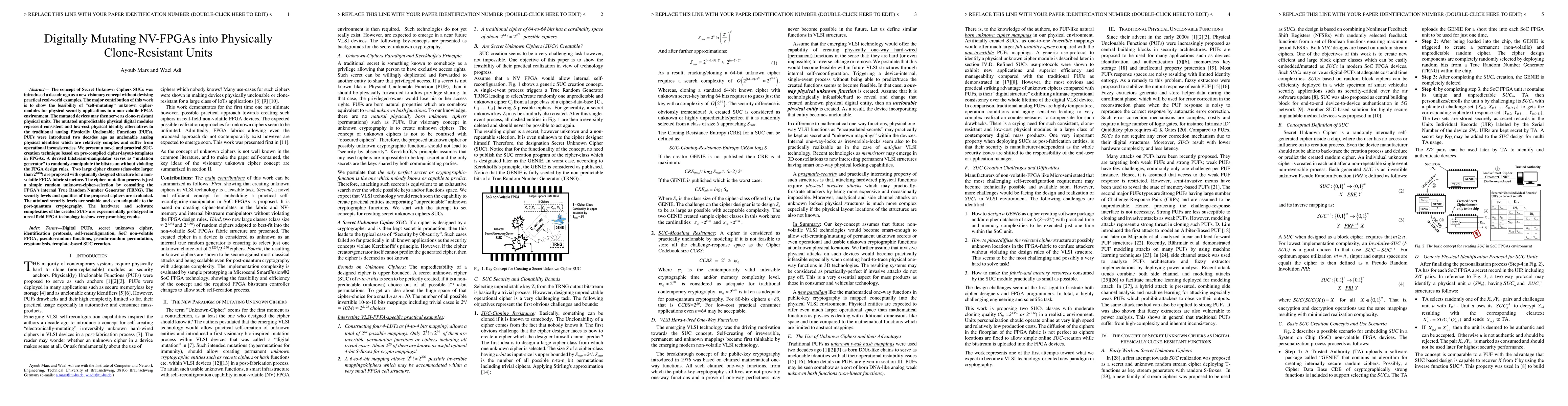 The concept of Secret Unknown Ciphers (SUCs) was introduced a decade ago as a new visionary concept without devising practical real-world examples. The major contribution of this work is to show the feasibility of "self-mutating" unknown cipher-modules for physical security applications in a non-volatile FPGA environment. The mutated devices may then serve as clone-resistant physical units. The mutated unpredictable physical-digital modules represent consistent and low-cost physical identity alternatives to the traditional analog Physically Unclonable Functions (PUFs). PUFs were introduced two decades ago as unclonable analog physical identities which are relatively complex and suffer from operational inconsistencies. We present a novel and practical SUC-creation technique based on pre-compiled cipher-layout-templates in FPGAs. A devised bitstream-manipulator serves as "mutation generator" to randomly-manipulate the bitstream without violating the FPGA design rules. Two large cipher classes (class-size larger than $2^{1000}$) are proposed with optimally designed structure for a non-volatile FPGA fabric structure. The cipher-mutation process is just a simple random unknown-cipher-selection by consulting the FPGA's internal True Random Number Generator (TRNG). The security levels and qualities of the proposed ciphers are evaluated. The attained security levels are scalable and even adaptable to the post-quantum cryptography. The hardware and software complexities of the created SUCs are experimentally prototyped in a real field FPGA technology to show very promising results.