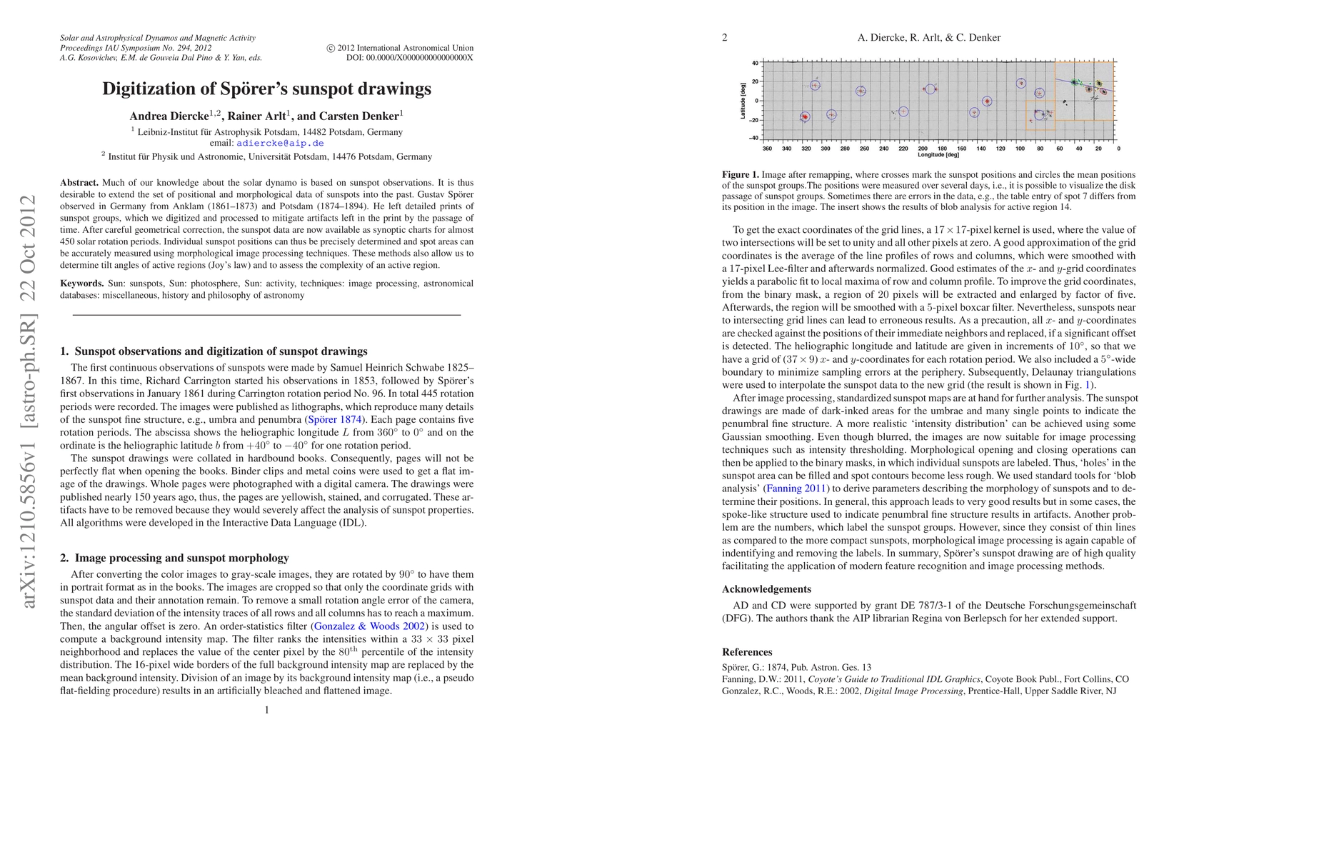 Much of our knowledge about the solar dynamo is based on sunspot observations. It is thus desirable to extend the set of positional and morphological data of sunspots into the past. Gustav Sp\"orer observed in Germany from Anklam (1861-1873) and Potsdam (1874-1894). He left detailed prints of sunspot groups, which we digitized and processed to mitigate artifacts left in the print by the passage of time. After careful geometrical correction, the sunspot data are now available as synoptic charts for almost 450 solar rotation periods. Individual sunspot positions can thus be precisely determined and spot areas can be accurately measured using morphological image processing techniques. These methods also allow us to determine tilt angles of active regions (Joy's law) and to assess the complexity of an active region.