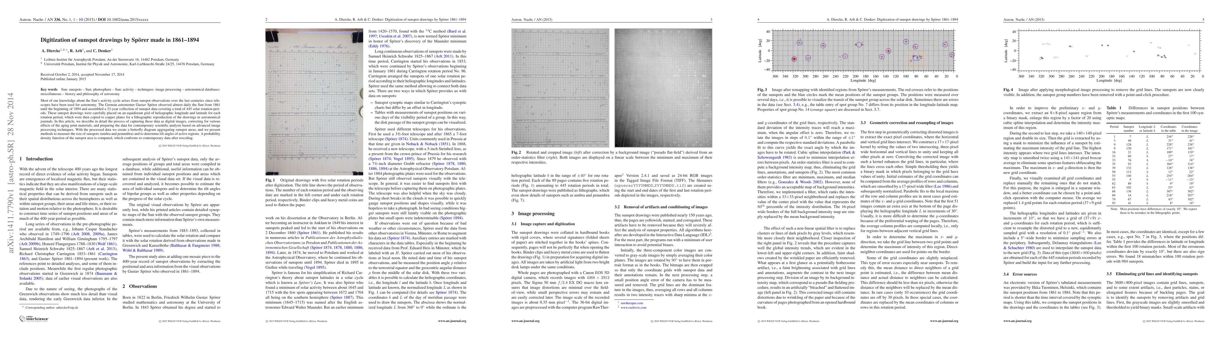 Researchers digitized sunspot drawings from 1861-1894, correcting for aging print effects and preparing data for modern analysis. They created a butterfly diagram aggregating sunspot areas and measured tilt angles of active regions with high accuracy.