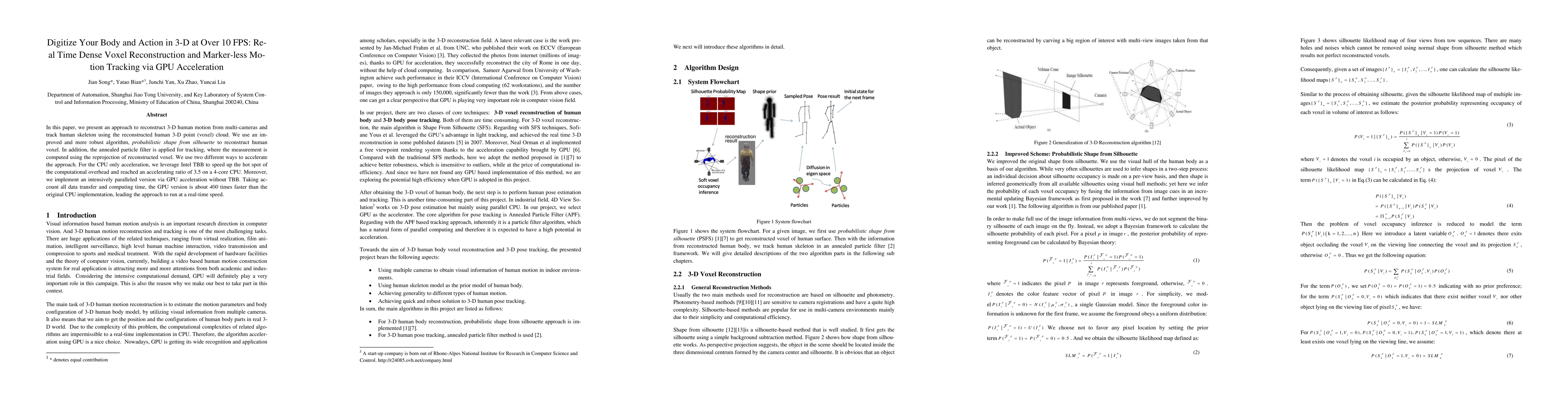 In this paper, we present an approach to reconstruct 3-D human motion from multi-cameras and track human skeleton using the reconstructed human 3-D point (voxel) cloud. We use an improved and more robust algorithm, probabilistic shape from silhouette to reconstruct human voxel. In addition, the annealed particle filter is applied for tracking, where the measurement is computed using the reprojection of reconstructed voxel. We use two different ways to accelerate the approach. For the CPU only acceleration, we leverage Intel TBB to speed up the hot spot of the computational overhead and reached an accelerating ratio of 3.5 on a 4-core CPU. Moreover, we implement an intensively paralleled version via GPU acceleration without TBB. Taking account all data transfer and computing time, the GPU version is about 400 times faster than the original CPU implementation, leading the approach to run at a real-time speed.