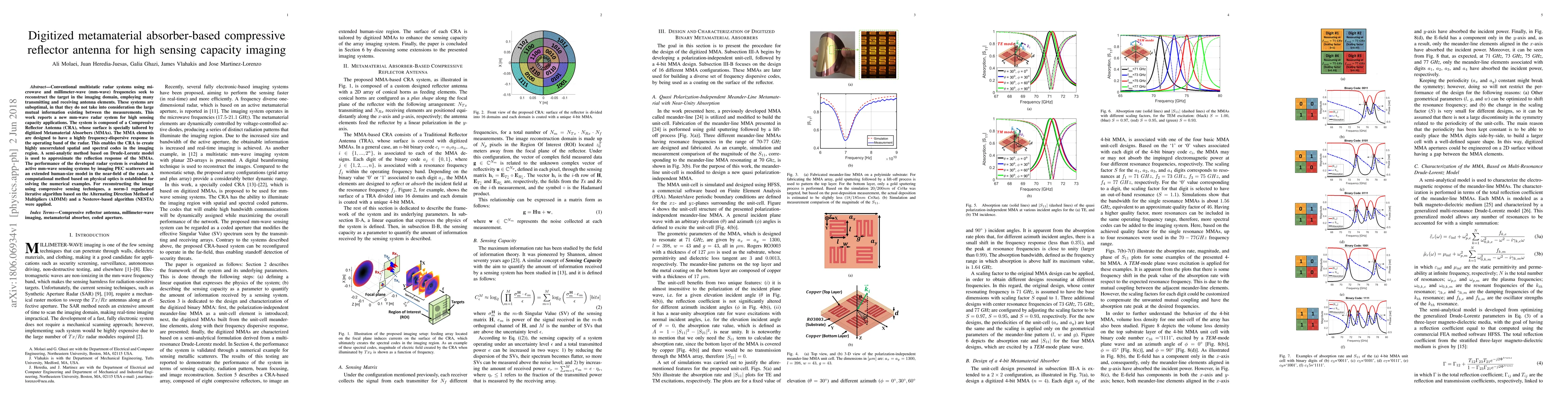 Conventional multistatic radar systems using microwave and millimeter-wave (mm-wave) frequencies seek to reconstruct the target in the imaging domain, employing many transmitting and receiving antenna elements. These systems are suboptimal, in that they do not take into consideration the large mutual information existing between the measurements. This work reports a new mm-wave radar system for high sensing capacity applications. The system is composed of a Compressive Reflector Antenna (CRA), whose surface is specially tailored by digitized Metamaterial Absorbers (MMAs). The MMA elements are designed to have a highly frequency-dispersive response in the operating band of the radar. This enables the CRA to create highly uncorrelated spatial and spectral codes in the imaging region. A semi-analytic method based on Drude-Lorentz model is used to approximate the reflection response of the MMAs. The performance of the developed radar system is evaluated in active mm-wave sensing systems by imaging PEC scatterers and an extended human-size model in the near-field of the radar. A computational method based on physical optics is established for solving the numerical examples. For reconstructing the image using compressive sensing techniques, a norm-1 regularized iterative algorithm based on the Alternating Direction Method of Multipliers (ADMM) and a Nesterov-based algorithm (NESTA) were applied.