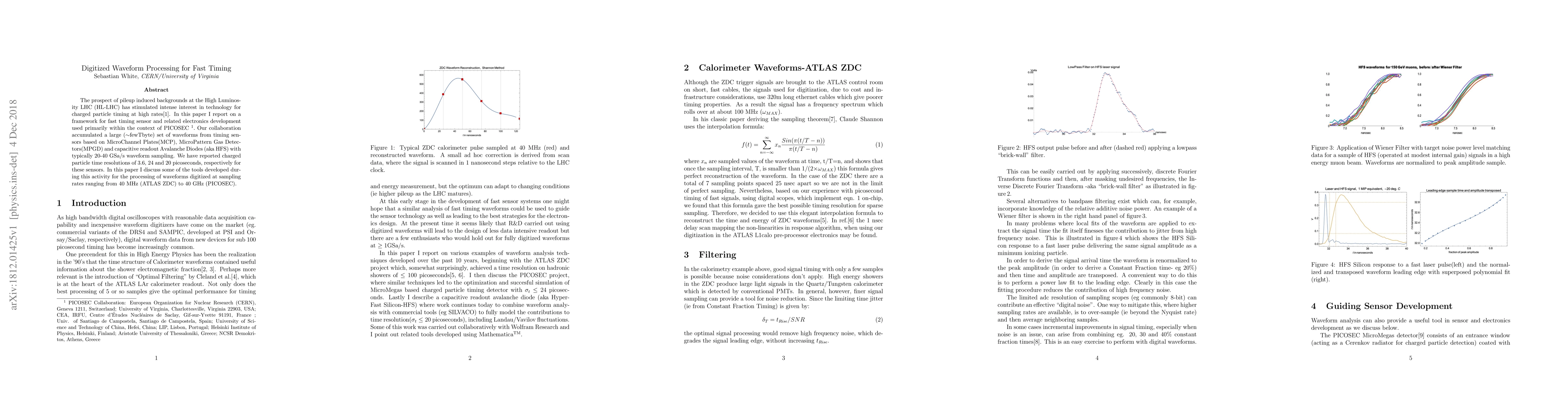 The prospect of pileup induced backgrounds at the High Luminosity LHC (HL-LHC) has stimulated intense interest in technology for charged particle timing at high rates\cite{challenge}. In this paper I report on a framework for fast timing sensor and related electronics development used primarily within the context of PICOSEC. Our collaboration accumulated a large ($\sim$fewTbyte) set of waveforms from timing sensors based on MicroChannel Plates(MCP), MicroPattern Gas Detectors(MPGD) and capacitive readout Avalanche Diodes (aka HFS) with typically 20-40 GSa/s waveform sampling. We have reported charged particle time resolutions of 3.6, 24 and 20 picoseconds, respectively for these sensors. In this paper I discuss some of the tools developed during this activity for the processing of waveforms digitized at sampling rates ranging from 40 MHz (ATLAS ZDC) to 40 GHz (PICOSEC).