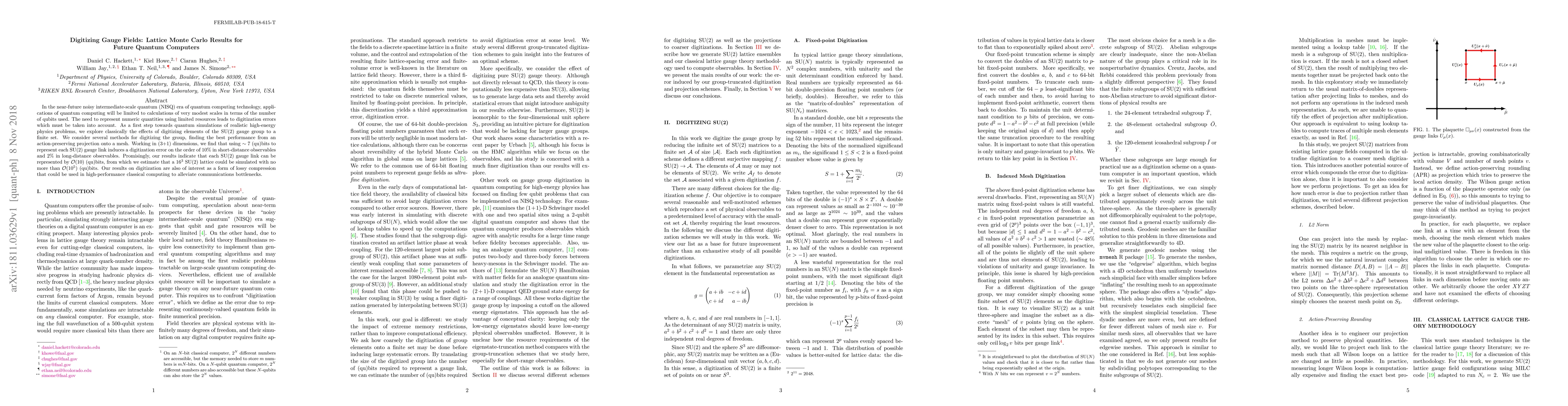 In the near-future noisy intermediate-scale quantum (NISQ) era of quantum computing technology, applications of quantum computing will be limited to calculations of very modest scales in terms of the number of qubits used. The need to represent numeric quantities using limited resources leads to digitization errors which must be taken into account. As a first step towards quantum simulations of realistic high-energy physics problems, we explore classically the effects of digitizing elements of the $\mathrm{SU}(2)$ gauge group to a finite set. We consider several methods for digitizing the group, finding the best performance from an action-preserving projection onto a mesh. Working in (3+1) dimensions, we find that using $\sim 7$ (qu)bits to represent each $\mathrm{SU}(2)$ gauge link induces a digitization error on the order of $10\%$ in short-distance observables and $2\%$ in long-distance observables. Promisingly, our results indicate that each $\mathrm{SU}(2)$ gauge link can be represented by $\mathcal{O}(10)$ (qu)bits, from which we estimate that a $16^3$ $\mathrm{SU}(2)$ lattice could be simulated with no more than $\mathcal{O}(10^5)$ (qu)bits. Our results on digitization are also of interest as a form of lossy compression that could be used in high-performance classical computing to alleviate communications bottlenecks.