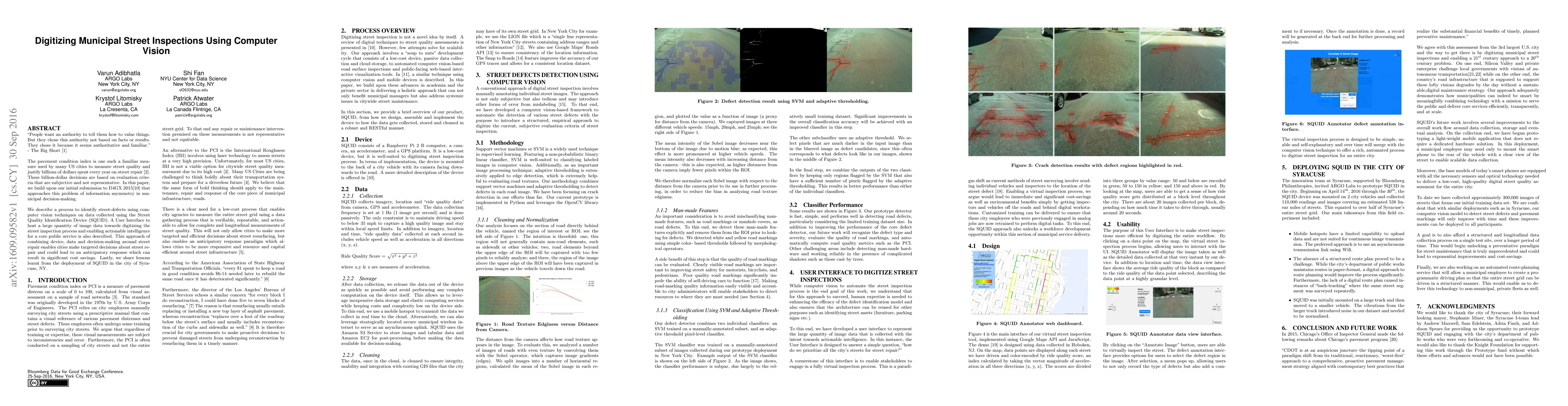 "People want an authority to tell them how to value things. But they chose this authority not based on facts or results. They chose it because it seems authoritative and familiar." - The Big Short The pavement condition index is one such a familiar measure used by many US cities to measure street quality and justify billions of dollars spent every year on street repair. These billion-dollar decisions are based on evaluation criteria that are subjective and not representative. In this paper, we build upon our initial submission to D4GX 2015 that approaches this problem of information asymmetry in municipal decision-making. We describe a process to identify street-defects using computer vision techniques on data collected using the Street Quality Identification Device (SQUID). A User Interface to host a large quantity of image data towards digitizing the street inspection process and enabling actionable intelligence for a core public service is also described. This approach of combining device, data and decision-making around street repair enables cities make targeted decisions about street repair and could lead to an anticipatory response which can result in significant cost savings. Lastly, we share lessons learnt from the deployment of SQUID in the city of Syracuse, NY.