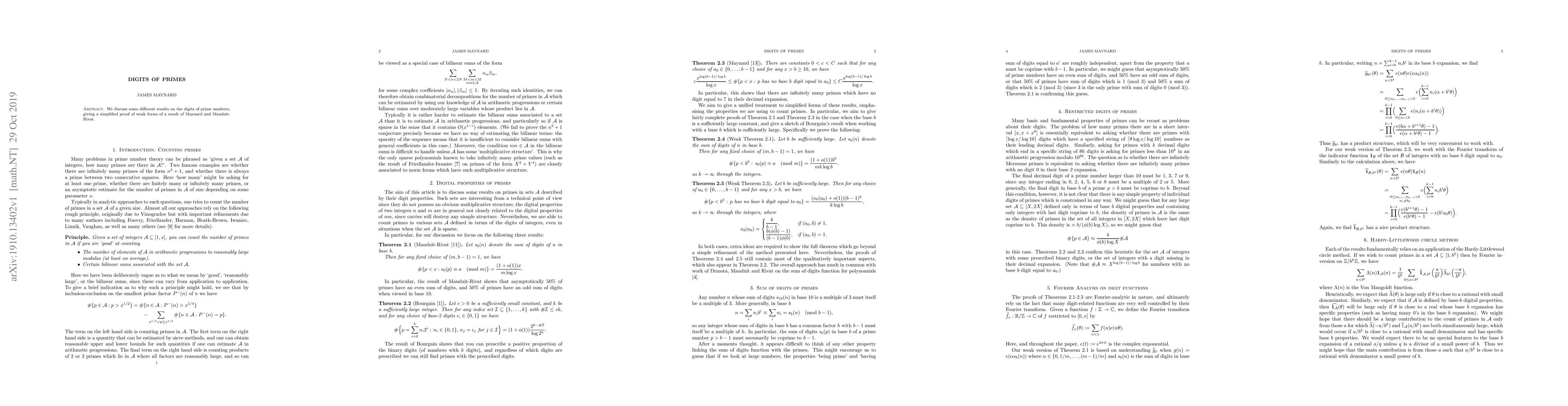 We survey some different results on the digits of prime numbers, giving a simplified proof of weak forms of a result of Maynard and Mauduit-Rivat.
