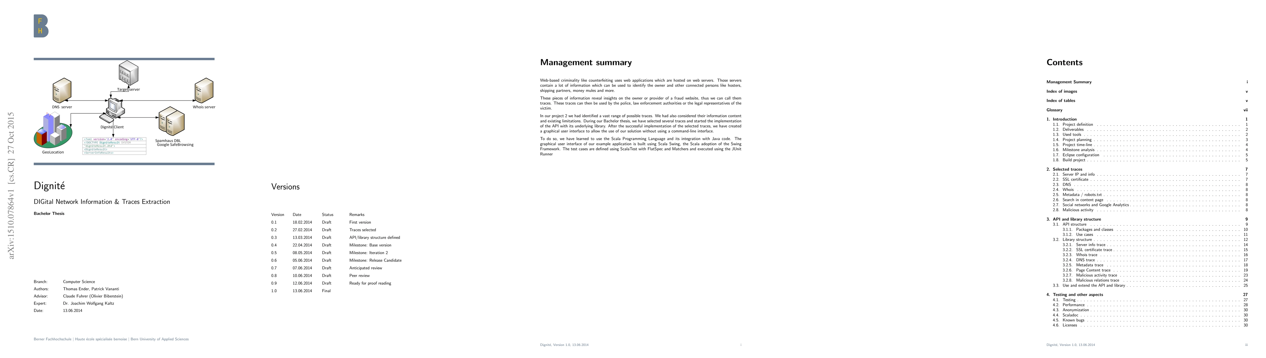 The Dignit\'e project aims to extract digital traces from web servers to identify web-based criminal activities, such as counterfeiting. The research developed a graphical user interface using Scala Swing for ease of use, alongside an API implemented in Scala with Java integration, and tested with ScalaTest and JUnit.