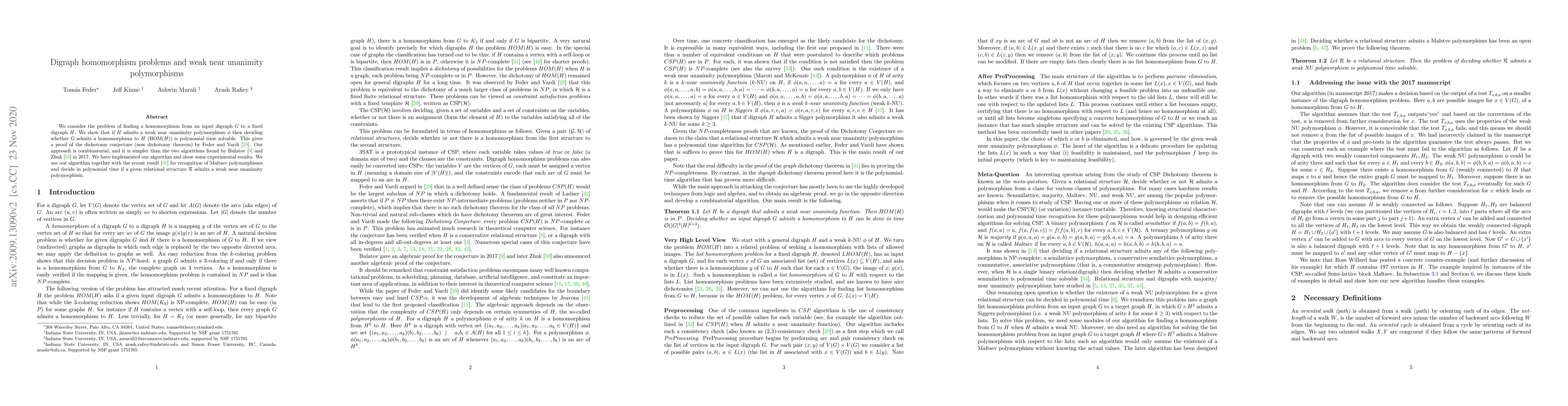 This paper demonstrates that if a fixed digraph $H$ possesses a weak near unanimity polymorphism, then determining the existence of a homomorphism from an input digraph $G$ to $H$ (HOM($H$)) can be solved in polynomial time, confirming the Feder and Vardi dichotomy theorem. The approach is combinatorial and simpler than previous algorithms.