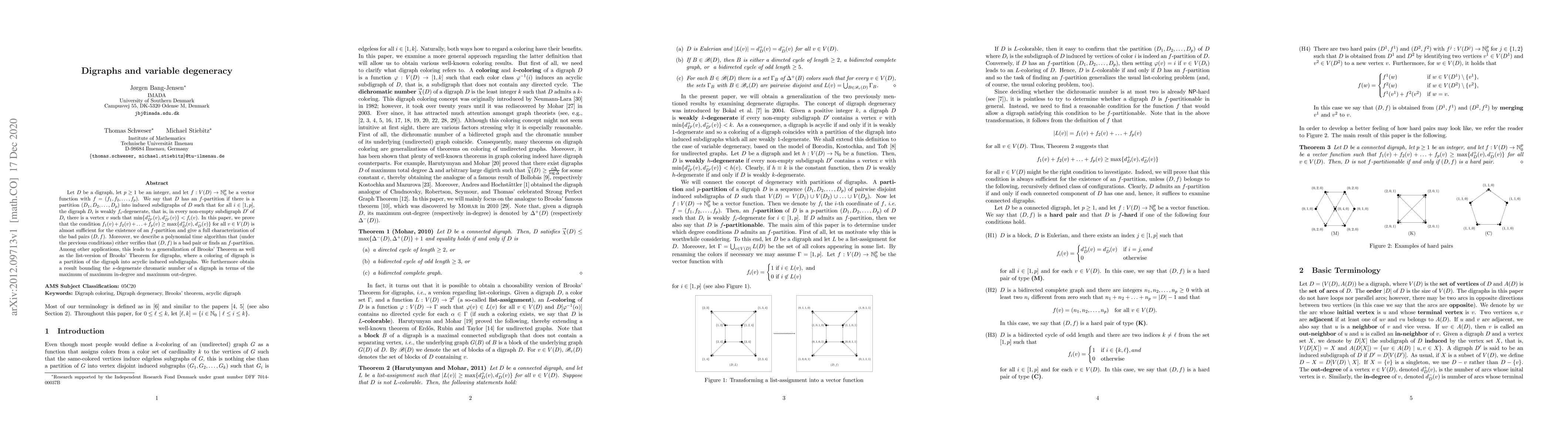 Let $D$ be a digraph, let $p \geq 1$ be an integer, and let $f: V(D) \to \mathbb{N}_0^p$ be a vector function with $f=(f_1,f_2,\ldots,f_p)$. We say that $D$ has an $f$-partition if there is a partition $(D_1,D_2,\ldots,D_p)$ into induced subdigraphs of $D$ such that for all $i \in [1,p]$, the digraph $D_i$ is weakly $f_i$-degenerate, that is, in every non-empty subdigraph $D'$ of $D_i$ there is a vertex $v$ such that $\min\{d_{D'}^+(v), d_{D'}^-(v)\} < f_i(v)$. In this paper, we prove that the condition $f_1(v) + f_2(v) + \ldots + f_p(v) \geq \max \{d_D^+(v),d_D^-(v)\}$ for all $v \in V(D)$ is almost sufficient for the existence of an $f$-partition and give a full characterization of the bad pairs $(D,f)$. Moreover, we describe a polynomial time algorithm that (under the previous conditions) either verifies that $(D,f)$ is a bad pair or finds an $f$-partition. Among other applications, this leads to a generalization of Brooks' Theorem as well as the list-version of Brooks' Theorem for digraphs, where a coloring of digraph is a partition of the digraph into acyclic induced subdigraphs. We furthermore obtain a result bounding the $s$-degenerate chromatic number of a digraph in terms of the maximum of maximum in-degree and maximum out-degree.