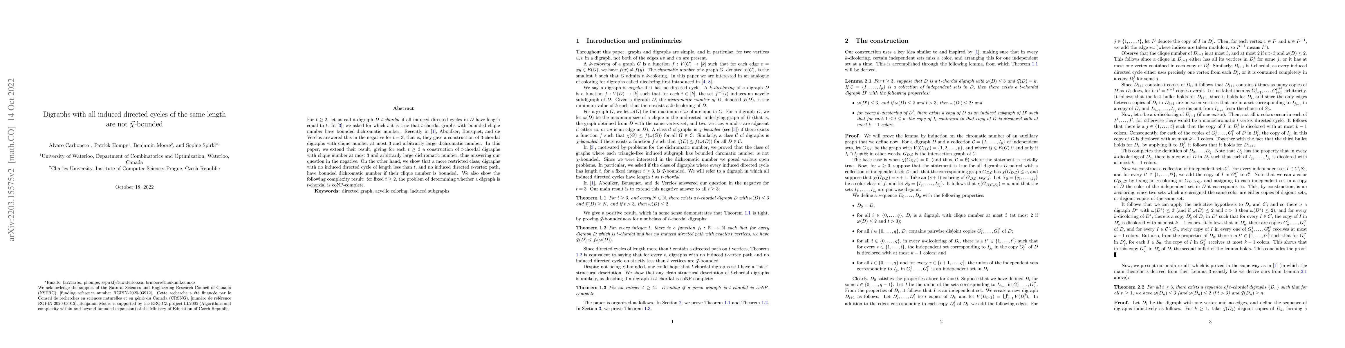 For $t \ge 2$, let us call a digraph $D$ \emph{t-chordal} if all induced directed cycles in $D$ have length equal to $t$. In a previous paper, we asked for which $t$ it is true that $t$-chordal graphs with bounded clique number have bounded dichromatic number. Recently, Aboulker, Bousquet, and de Verclos answered this in the negative for $t=3$, that is, they gave a construction of $3$-chordal digraphs with clique number at most $3$ and arbitrarily large dichromatic number. In this paper, we extend their result, giving for each $t \ge 3$ a construction of digraphs with clique number at most $3$ and arbitrarily large dichromatic number, thus answering our question in the negative. On the other hand, we show that a more restricted class, digraphs with no induced directed cycle of length less than $t$, and no induced directed $t$-vertex path, have bounded dichromatic number if their clique number is bounded. We also show the following complexity result: for fixed $t \ge 2$, the problem of determining whether a digraph is $t$-chordal is coNP-complete.