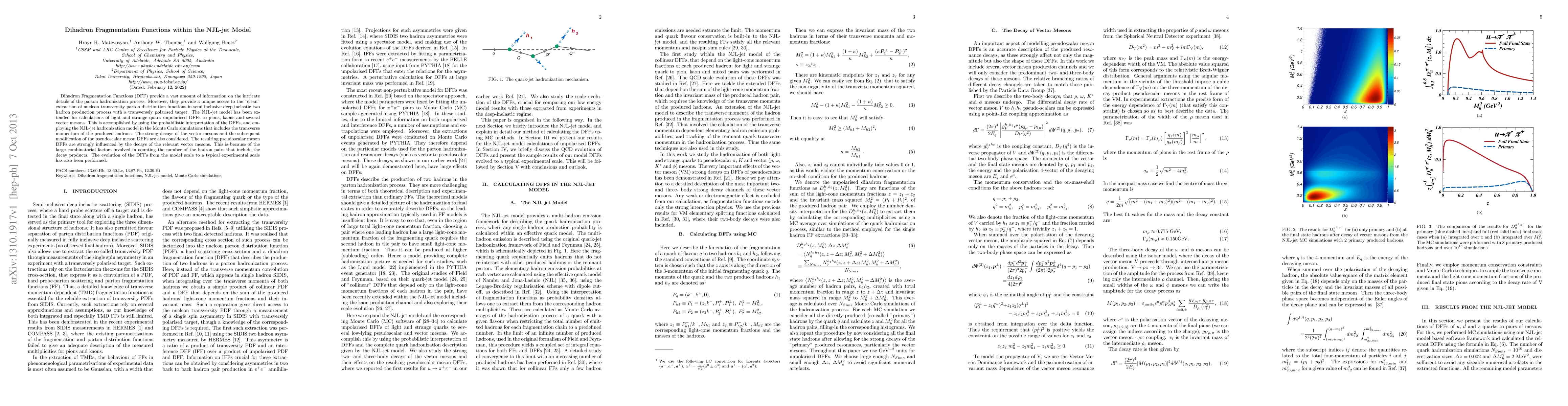 This paper investigates dihadron fragmentation functions (DFF) using the NJL-jet model to provide insights into parton hadronization and nucleon transversity parton distribution functions. The study extends the NJL-jet model to calculate unpolarised DFFs for pions, kaons, and vector mesons, considering strong decays and their impact on pseudoscalar meson DFFs.
