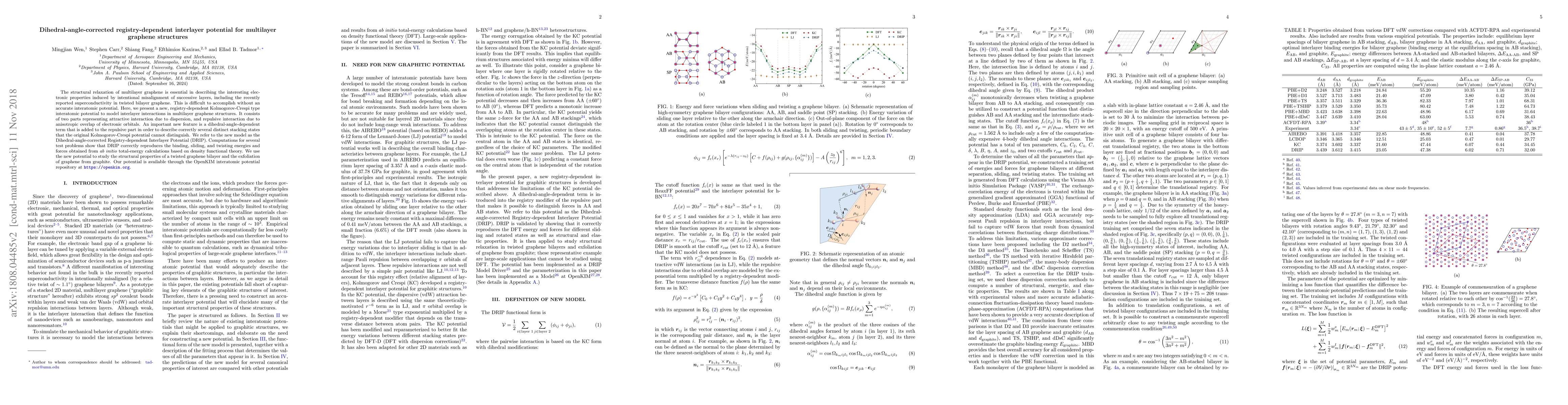The development and validation of a new registry-dependent interatomic potential, DRIP, which includes a dihedral-angle-dependent term to accurately model interlayer interactions in multilayer graphene structures.