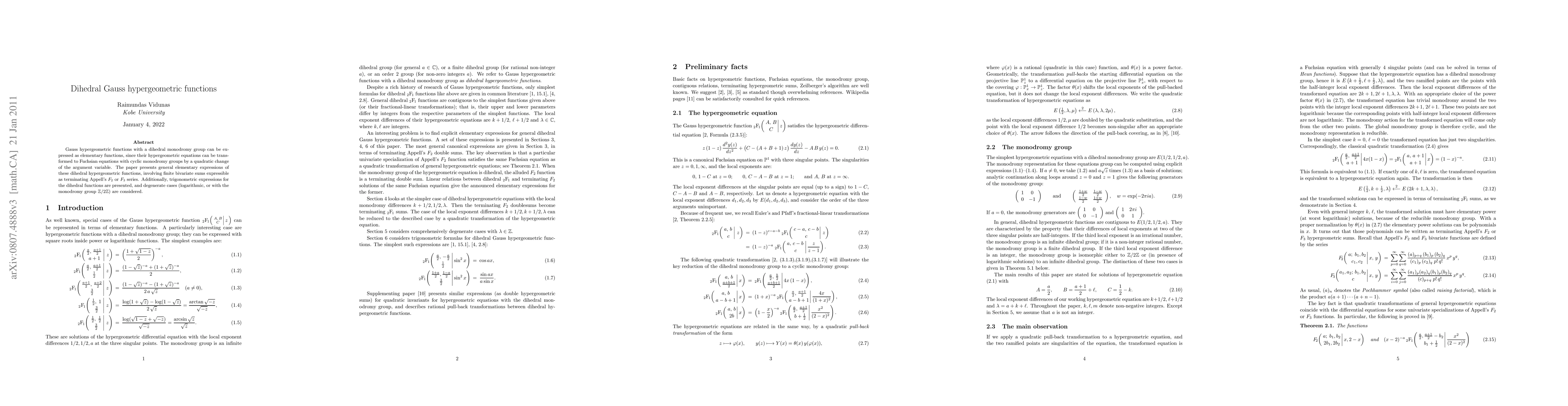 This paper expresses Gauss hypergeometric functions with dihedral monodromy as elementary functions, transforming their hypergeometric equations to Fuchsian equations via a quadratic argument change. The study provides general elementary expressions involving finite bivariate sums and terminating Appell series, along with trigonometric expressions and analysis of degenerate cases.