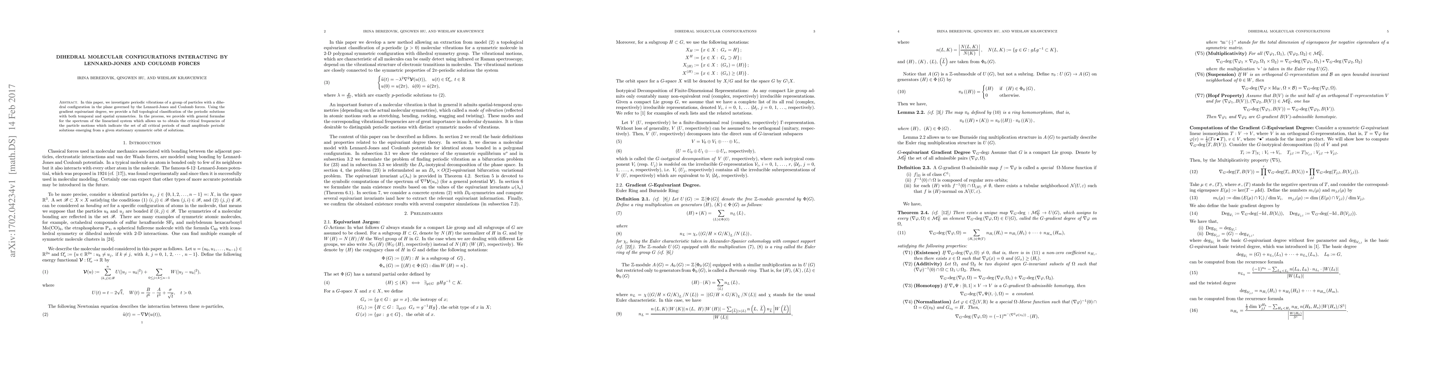 In this paper, we investigate periodic vibrations of a group of particles with a dihedral configuration in the plane governed by the Lennard-Jones and Coulomb forces. Using the gradient equivariant degree, we provide a full topological classification of the periodic solutions with both temporal and spatial symmetries. In the process, we provide with general formulae for the spectrum of the linearized system which allows us to obtain the critical frequencies of the particle motions which indicate the set of all critical periods of small amplitude periodic solutions emerging from a given stationary symmetric orbit of solutions.