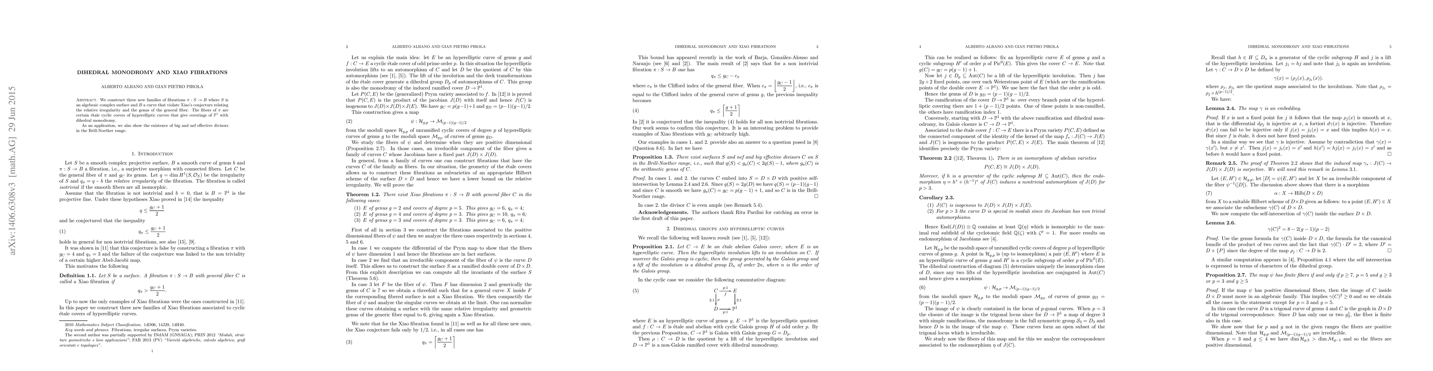 We construct three new families of fibrations $\pi : S \to B$ where $S$ is an algebraic complex surface and $B$ a curve that violate Xiao's conjecture relating the relative irregularity and the genus of the general fiber. The fibers of $\pi$ are certain \'etale cyclic covers of hyperelliptic curves that give coverings of $P^1$ with dihedral monodromy. As an application, we also show the existence of big and nef effective divisors in the Brill-Noether range.