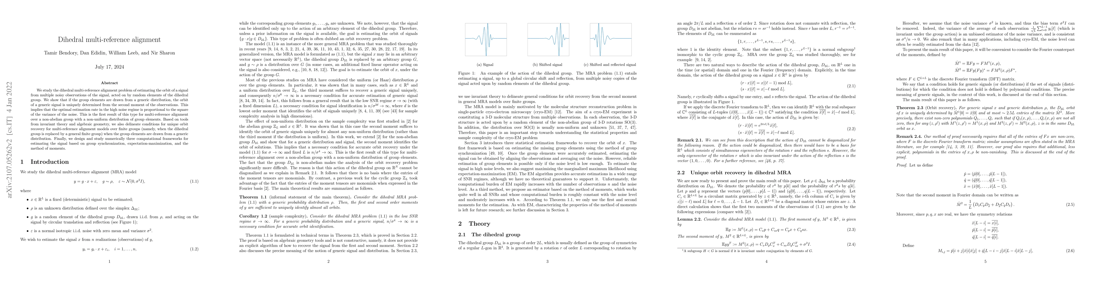 We study the dihedral multi-reference alignment problem of estimating the orbit of a signal from multiple noisy observations of the signal, acted on by random elements of the dihedral group. We show that if the group elements are drawn from a generic distribution, the orbit of a generic signal is uniquely determined from the second moment of the observations. This implies that the optimal estimation rate in the high noise regime is proportional to the square of the variance of the noise. This is the first result of this type for multi-reference alignment over a non-abelian group with a non-uniform distribution of group elements. Based on tools from invariant theory and algebraic geometry, we also delineate conditions for unique orbit recovery for multi-reference alignment models over finite groups (namely, when the dihedral group is replaced by a general finite group) when the group elements are drawn from a generic distribution. Finally, we design and study numerically three computational frameworks for estimating the signal based on group synchronization, expectation-maximization, and the method of moments.