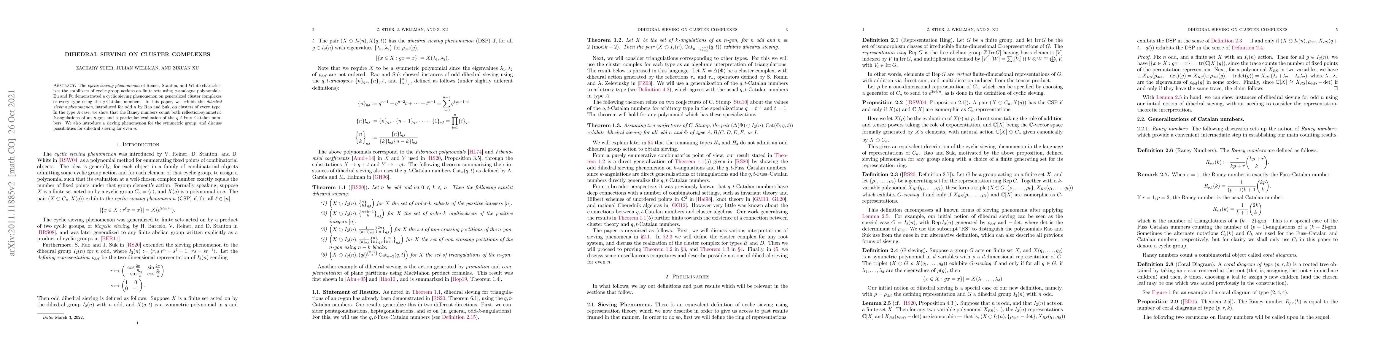 The cyclic sieving phenomenon of Reiner, Stanton, and White characterizes the stabilizers of cyclic group actions on finite sets using q-analogue polynomials. Eu and Fu demonstrated a cyclic sieving phenomenon on generalized cluster complexes of every type using the q-Catalan numbers. In this paper, we exhibit the dihedral sieving phenomenon, introduced for odd n by Rao and Suk, on clusters of every type. In the type A case, we show that the Raney numbers count both reflection-symmetric k-angulations of an n-gon and a particular evaluation of the (q,t)-Fuss--Catalan numbers. We also introduce a sieving phenomenon for the symmetric group, and discuss possibilities for dihedral sieving for even n.