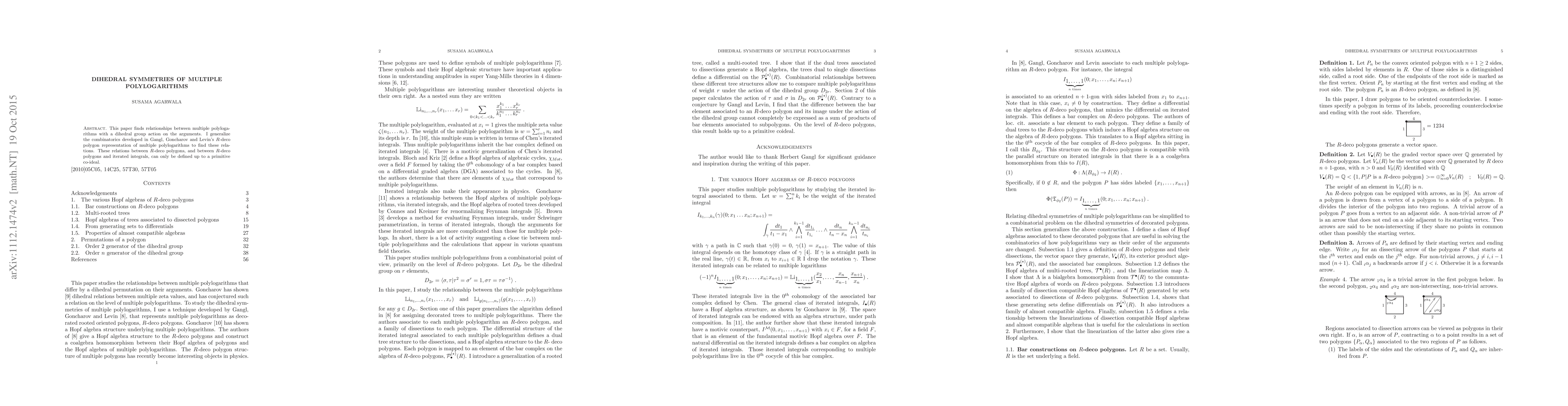 This paper establishes relationships between multiple logarithms through dihedral group actions on their arguments, extending the combinatorics of R-deco polygon representations to arbitrary fields, and expressing multiple logarithms as iterated integrals.