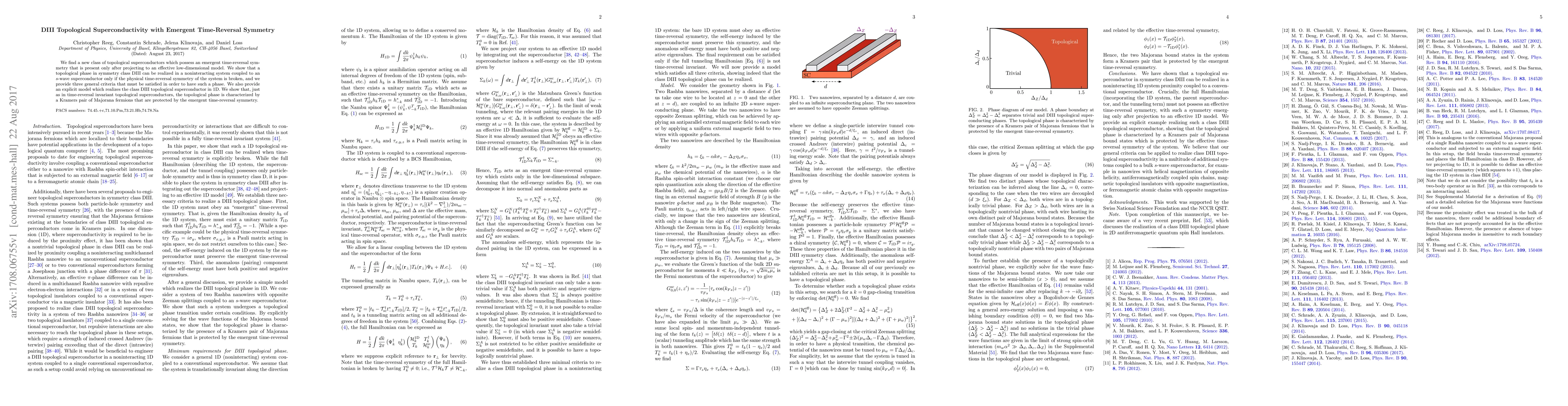 This paper introduces a new class of topological superconductors in symmetry class DIII that exhibit an emergent time-reversal symmetry, realized under specific conditions. It provides criteria and an explicit 1D model for this phase, characterized by Kramers pairs of Majorana fermions.