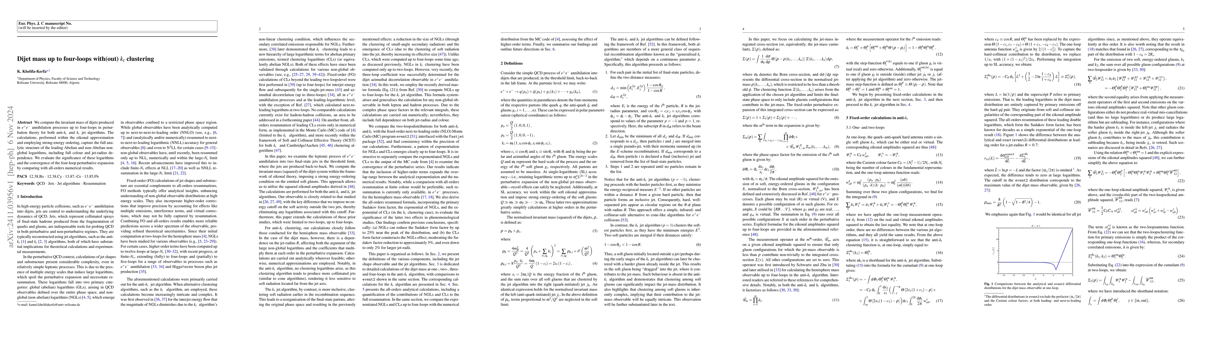 This paper presents the four-loop calculations for the invariant mass of dijets in $e^+ e^-$ annihilation using both anti-$k_t$ and $k_t$ jet algorithms, capturing non-global logarithms and assessing the convergence of the perturbative expansion through comparison with numerical results. The study employs the eikonal approximation and strong-energy ordering.