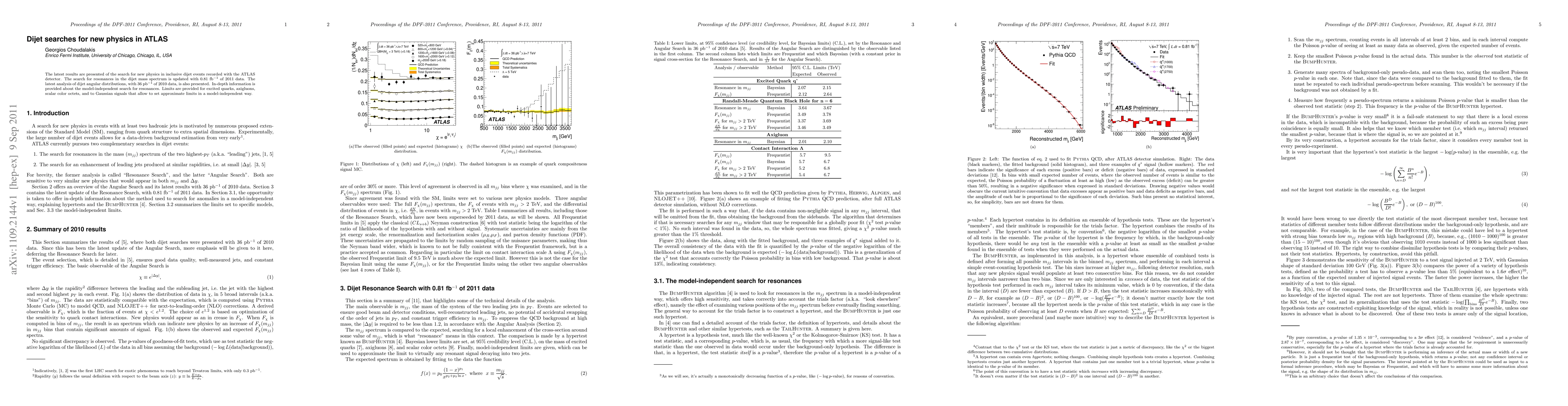 This paper presents updated results from the ATLAS detector on searches for new physics in dijet events, using 2011 data for resonance searches and 2010 data for angular distributions. It provides limits on various hypothetical particles and signals, including excited quarks, axigluons, and scalar color octets, in a model-independent framework.