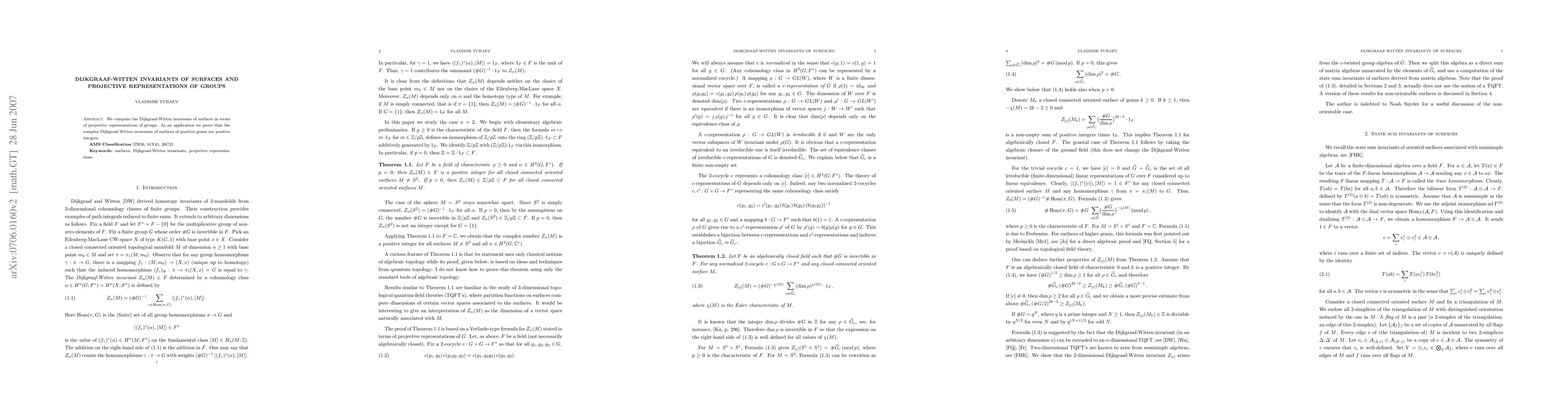 Summary: This paper calculates Dijkgraaf-Witten invariants of surfaces using projective representations of groups and demonstrates that these invariants for surfaces with positive genus are positive integers.